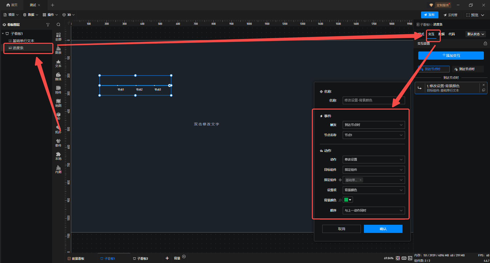 2.选中进度条组件,添加交互,触发“到达节点时”事件,“节点名称”可以按需选择,“动作”为“修改设置”,“目标组件”为“指定组件”,“指定组件”为“基础单行文本”,“设置项”为“背景颜色”,“背景颜色”按需选择,其他节点均采用相同设置方式。