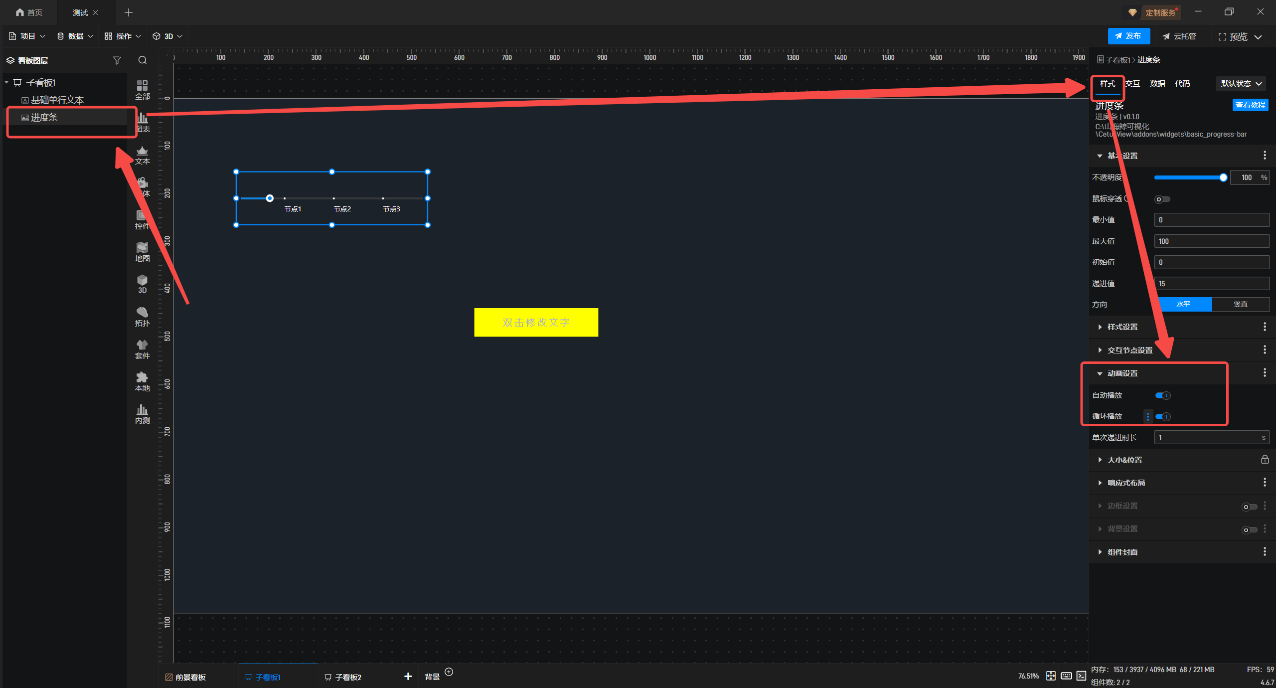 4.选中进度条,在 “样式” 配置栏中选择 “动画设置”,开启 “自动播放” 与 “循环播放” 功能。