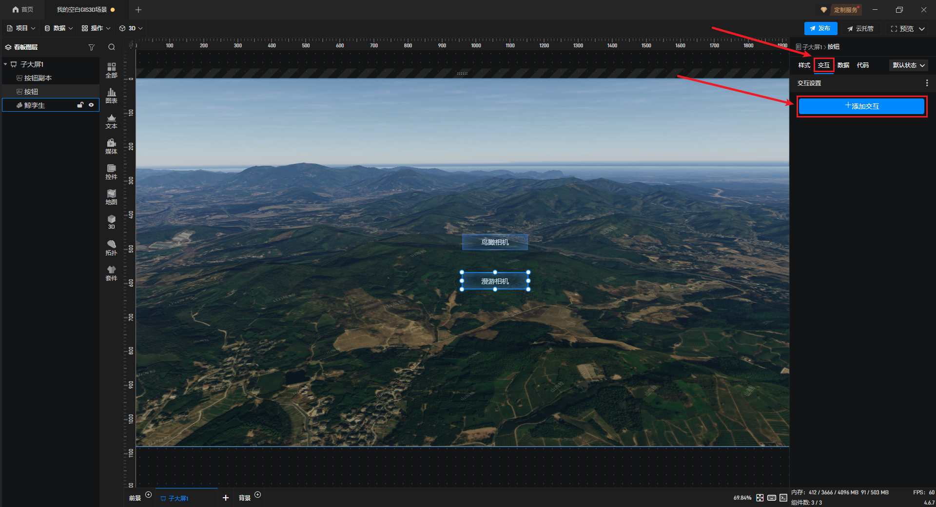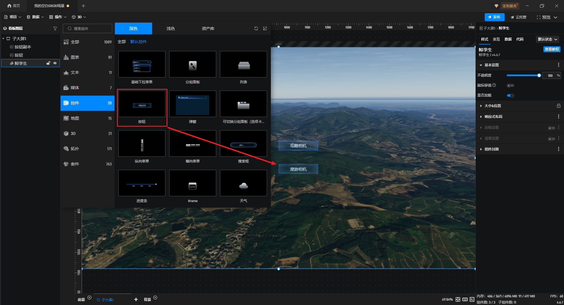 添加两个“按钮”组件,分别命名为“鸟瞰相机”和“漫游相机”。