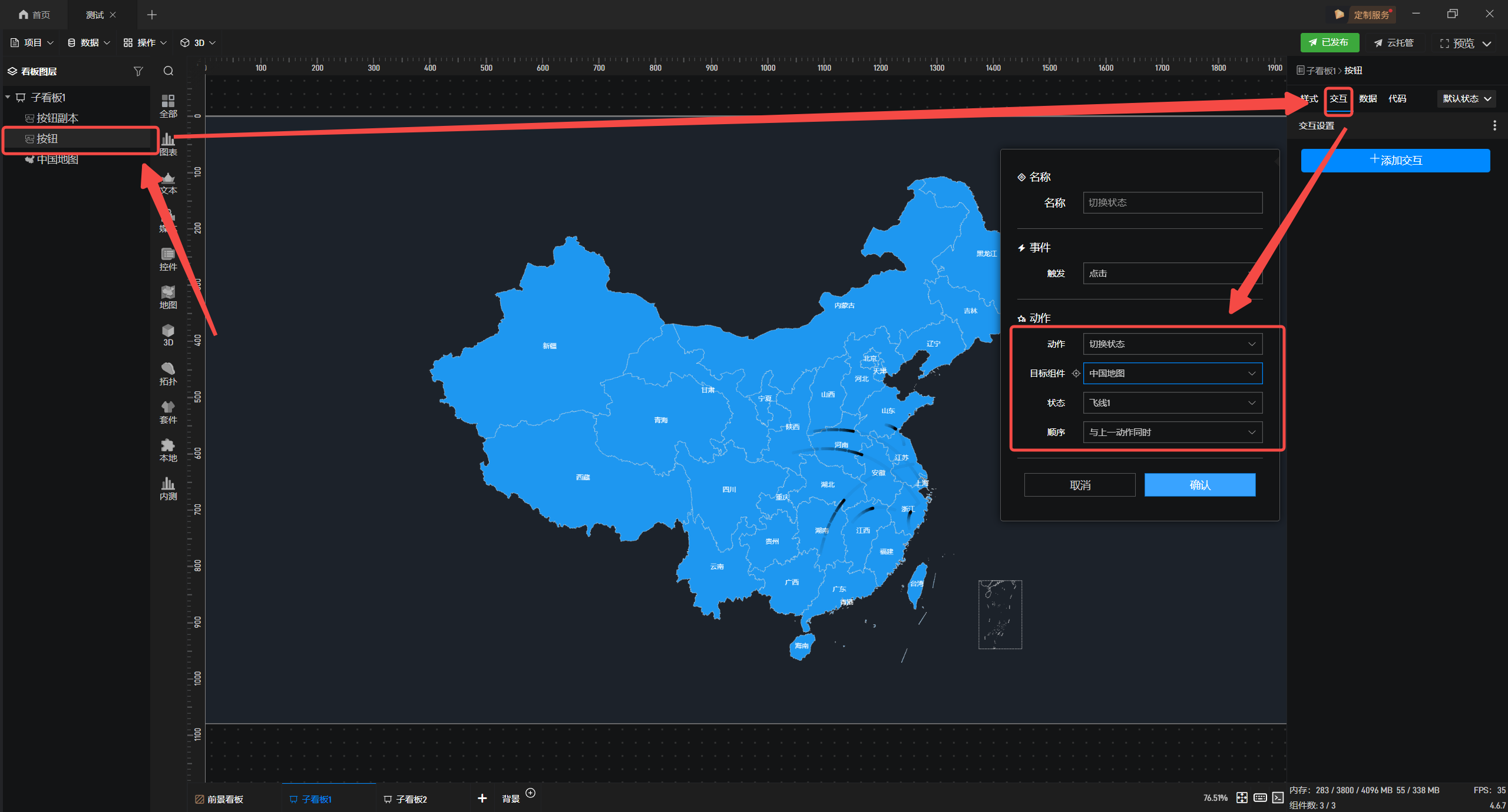 接着选中按钮组件,在右侧配置栏添加“交互”,触发“点击”事件,“动作”选择“切换状态”,目标组件设为“中国地图”,并关联上述“新建状态”;另一按钮按相同方式配置,仅切换对应状态即可。