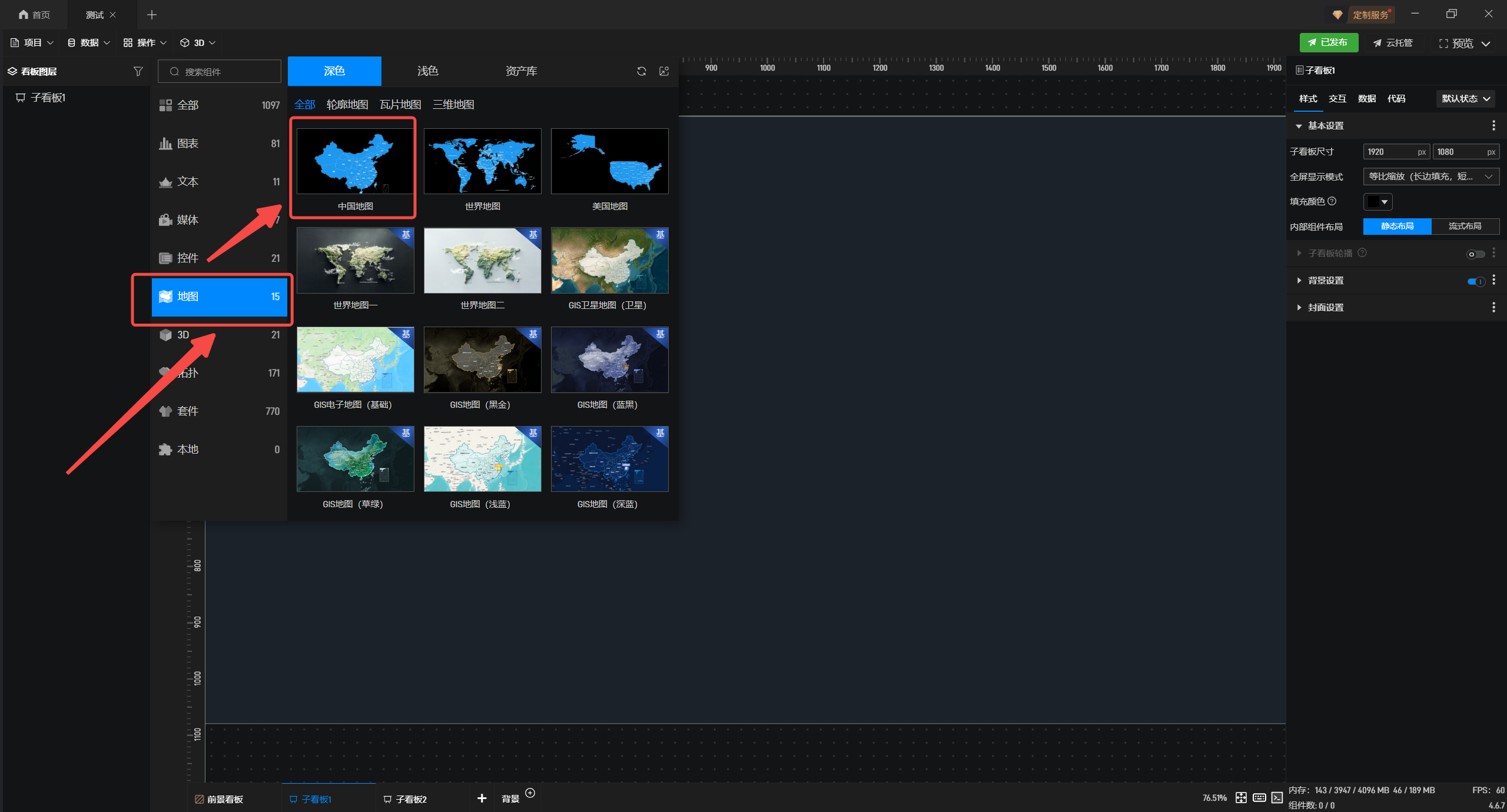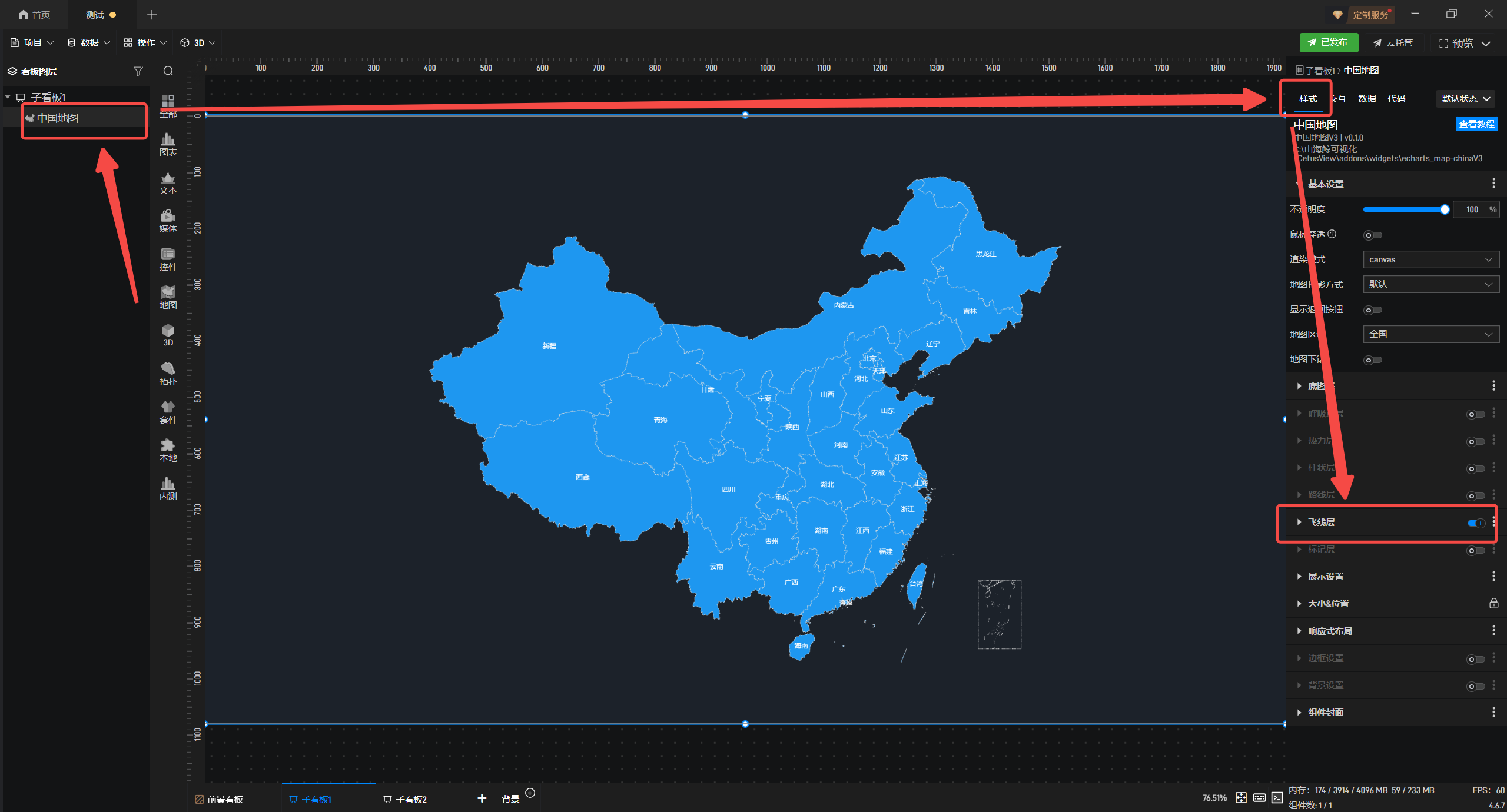 1.在左侧组件库添加“中国地图”组件至项目中。