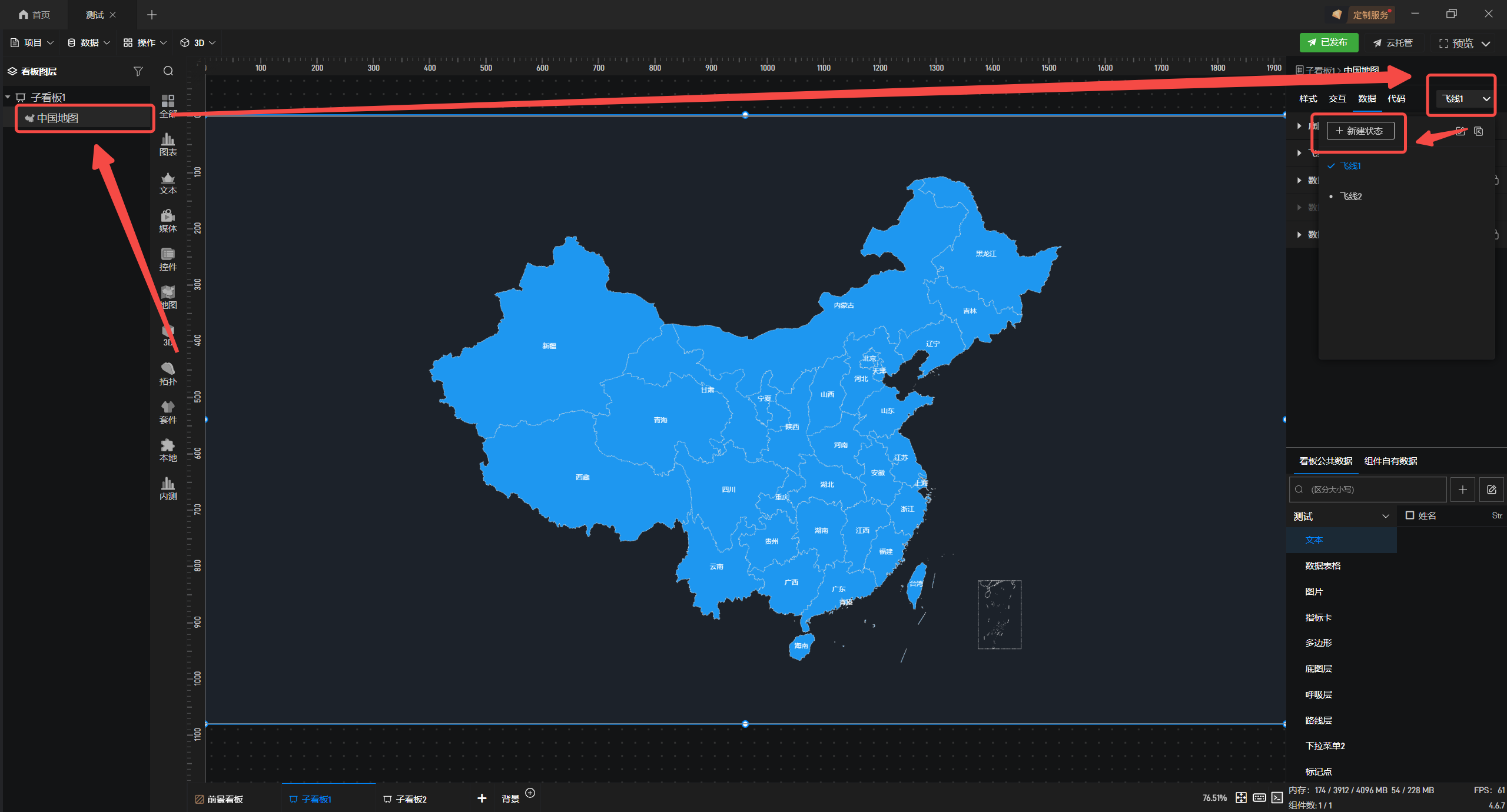 2.选中中国地图组件,在右侧配置栏中完成“新建状态”操作并重新命名。