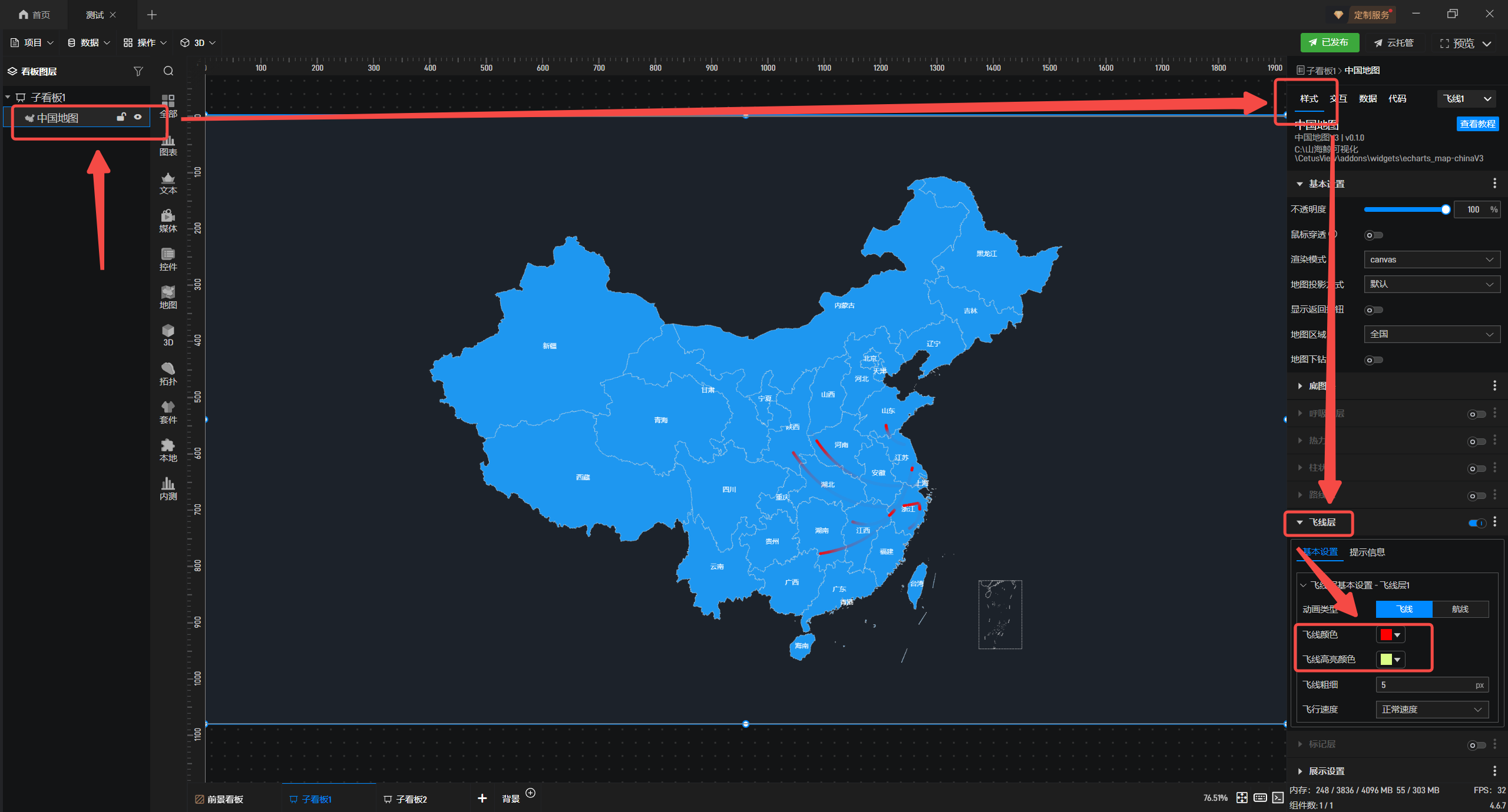 为展示的更加明显,可以在“样式”配置栏中,选择“飞线层”,修改“飞线颜色”和“飞线粗细”。