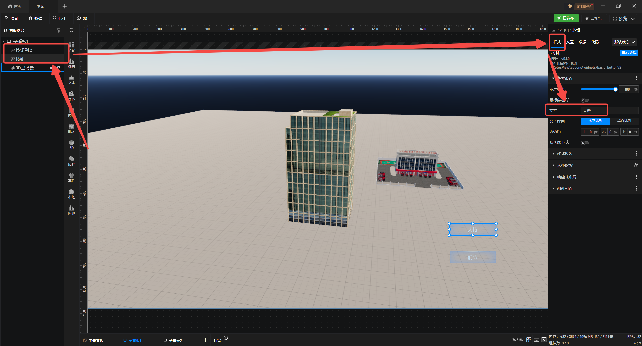 接着选中按钮组件,在右侧“样式”配置栏中修改对应的“文本”名称,其他按钮可按此方法依次设置,便于后续添加交互操作。