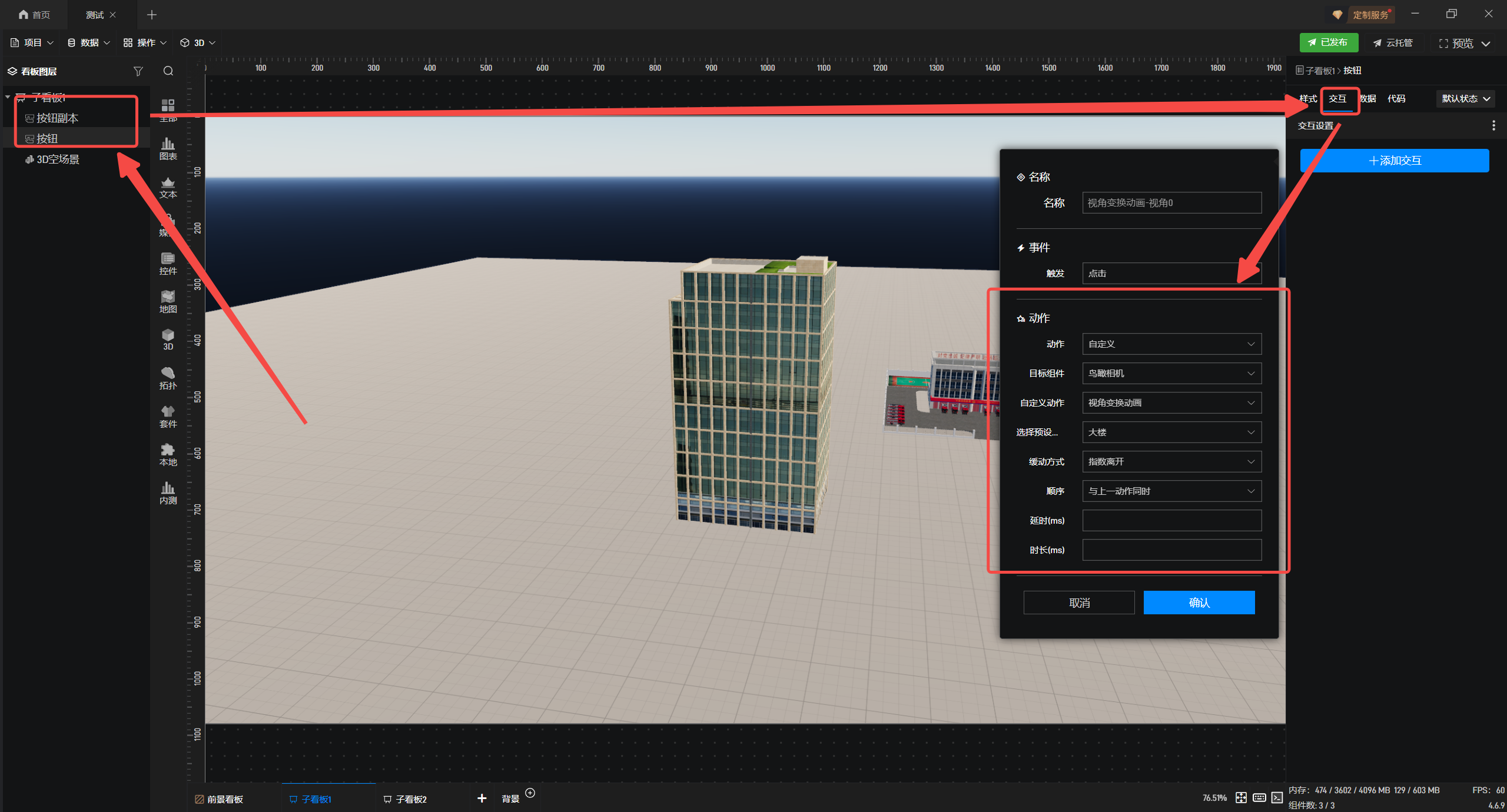 接着添加交互,触发“点击”事件,执行“自定义”操作,“目标组件”为“鸟瞰相机”,“自定义动作”为“视角变换动画”,“选择预设视角”为“大楼”,其他视角可按此方法依次设置。