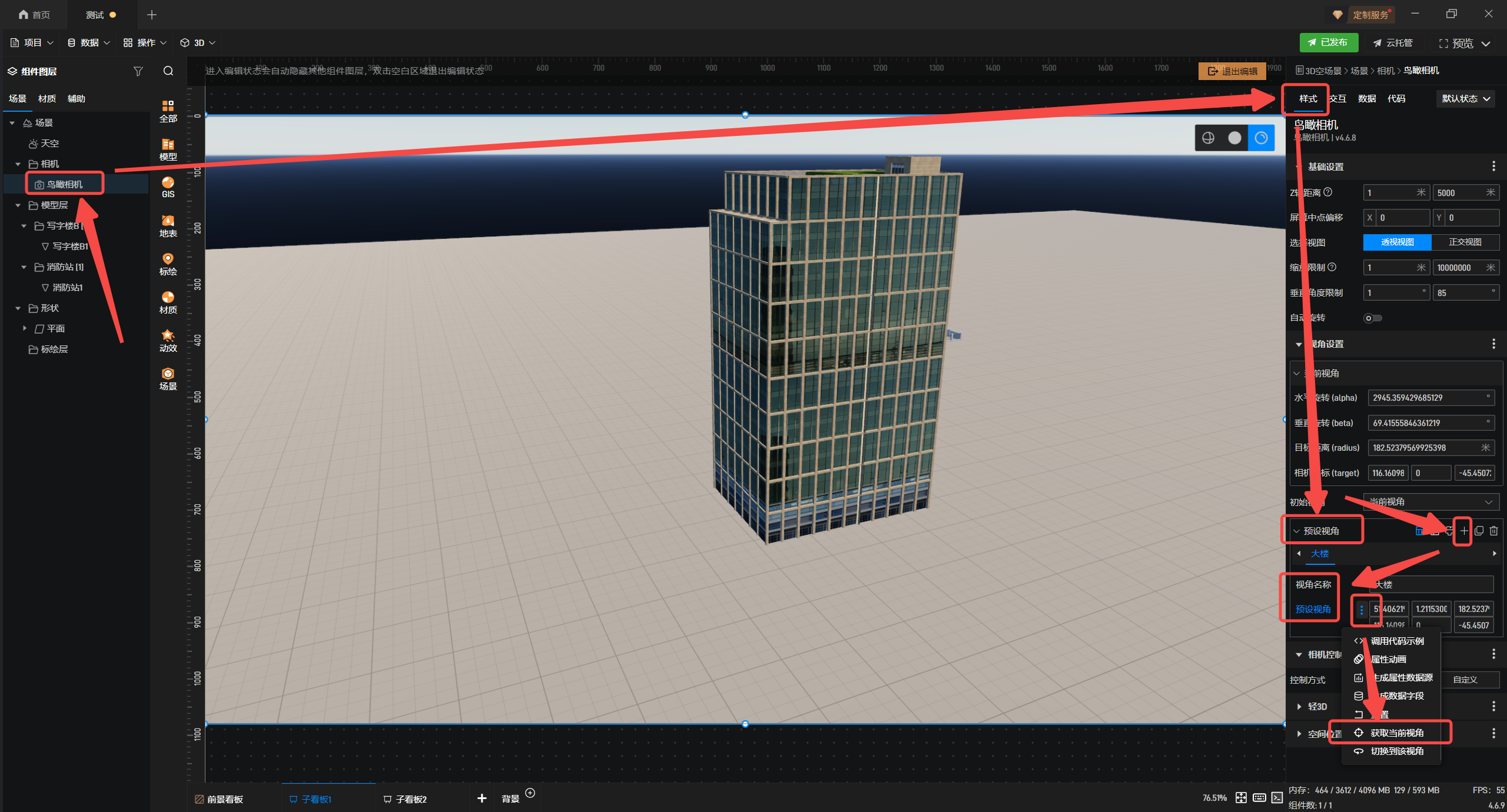 2.在左侧配置栏选择“鸟瞰相机”,在右侧“样式”面板中选择“预设视角”,修改“视角名称”与“预设视角”,并点击“预设视角”旁的“扩展样式”并“获取当前视角”,其他视角可按此方法依次设置。