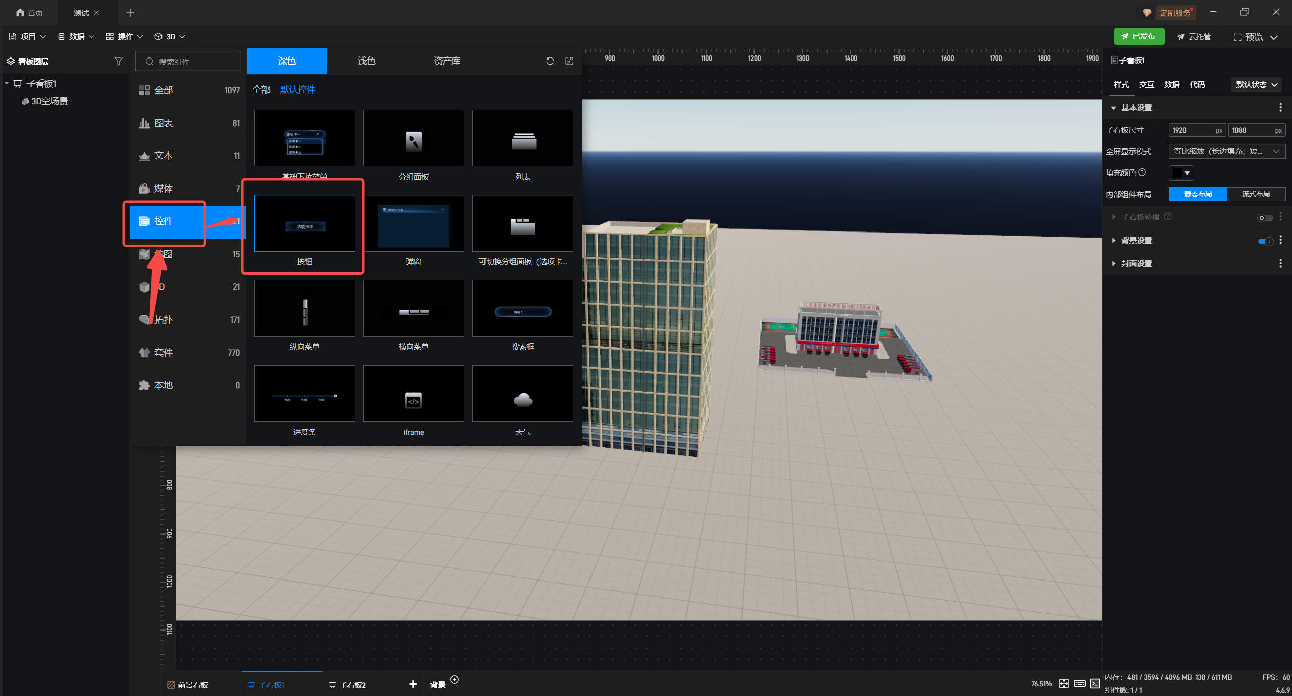 1.在左侧组件库添加“3D空场景”至项目中。