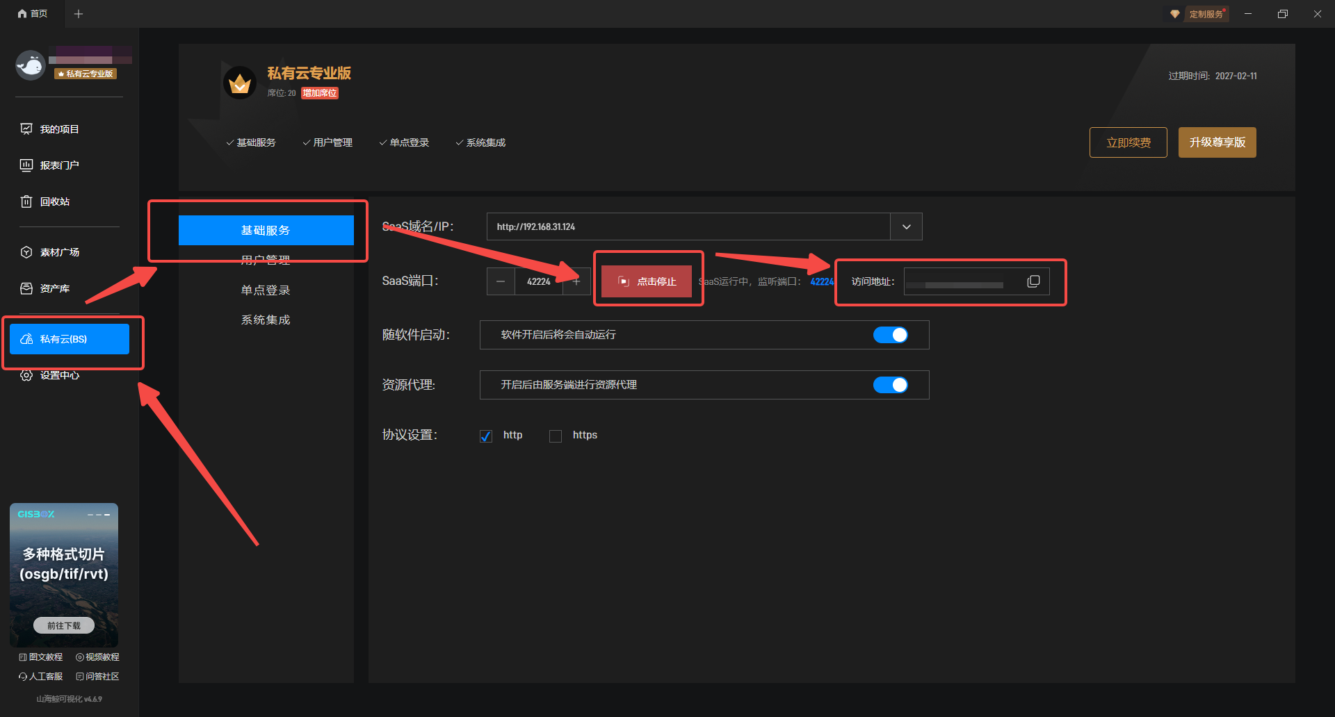 2.在左侧点击“私有云(BS)”选择“基础服务”再“点击启动”,接着弹出一个“访问地址”。