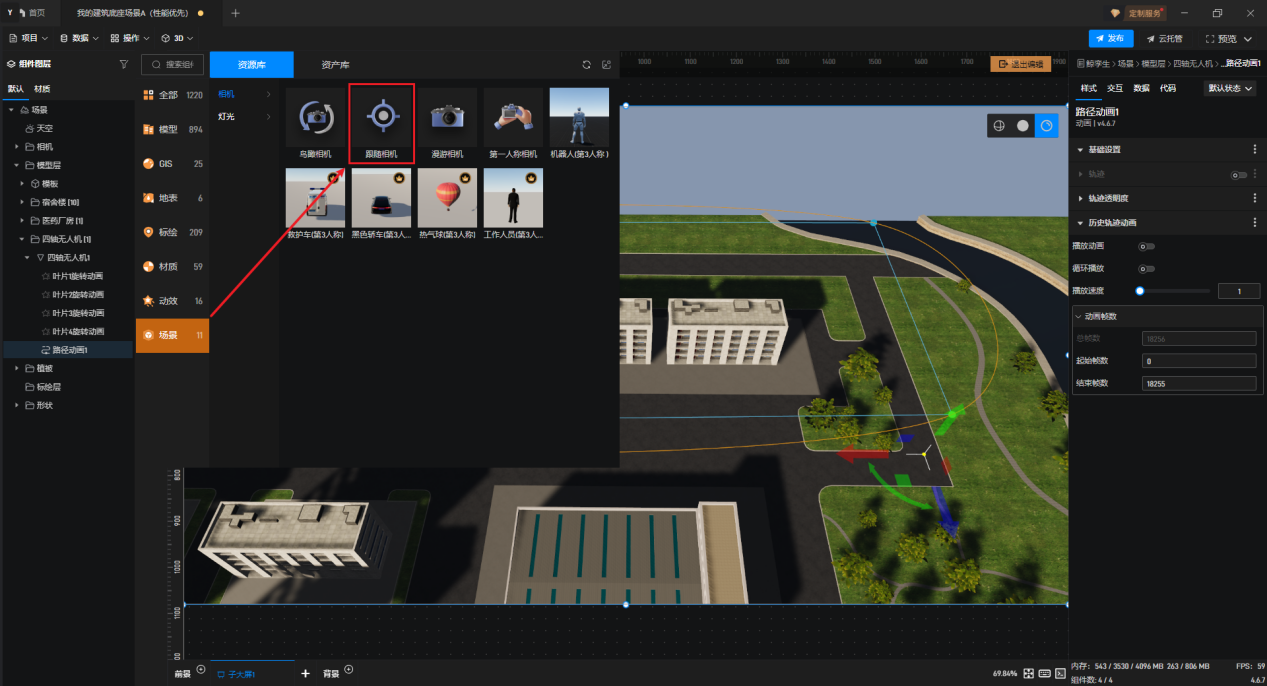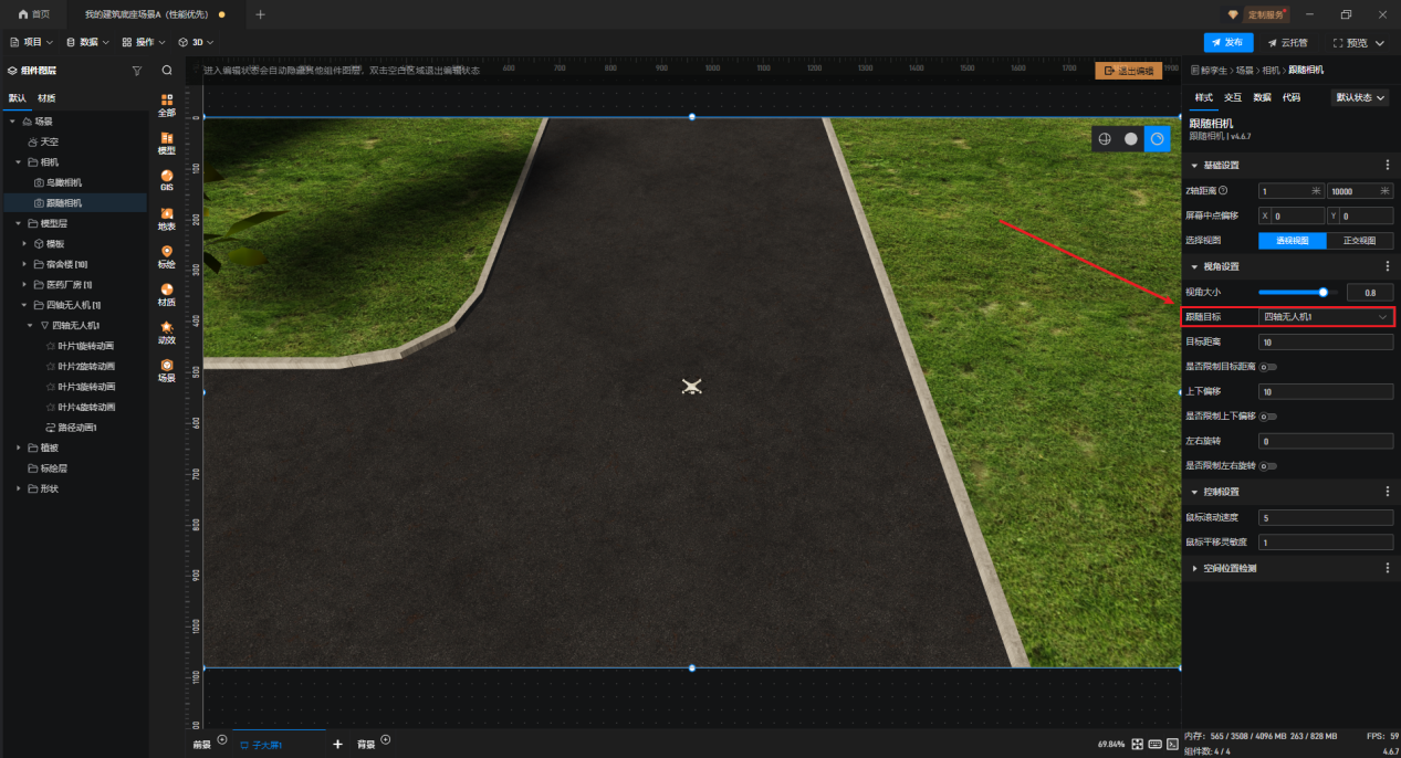 7. 在右侧“样式”设置中,将“跟随目标”设为“四轴无人机”,双击左侧“跟随相机”图层可以跳转至跟随相机视角。