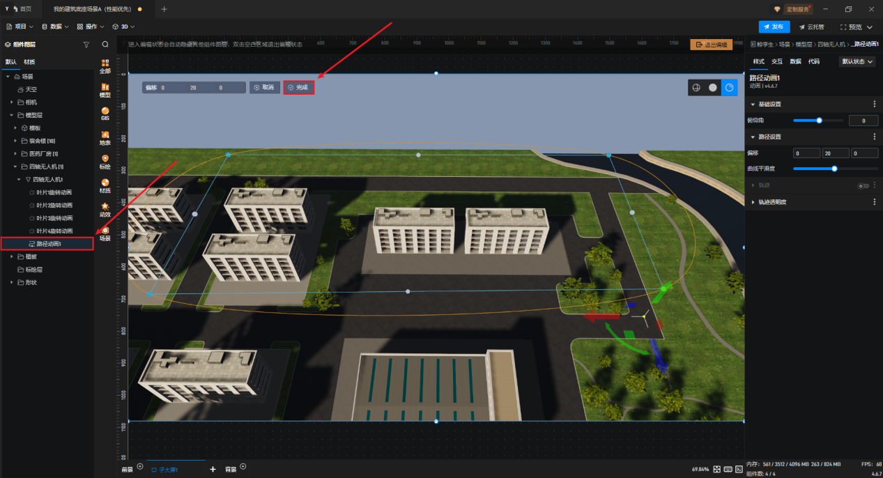 在制作城市、工厂等项目时,我们有时候希望通过无人机的第三人称视角来游览整个场景。实际操作中,我们可以通过将路径动画与跟随相机结合来达成该效果。