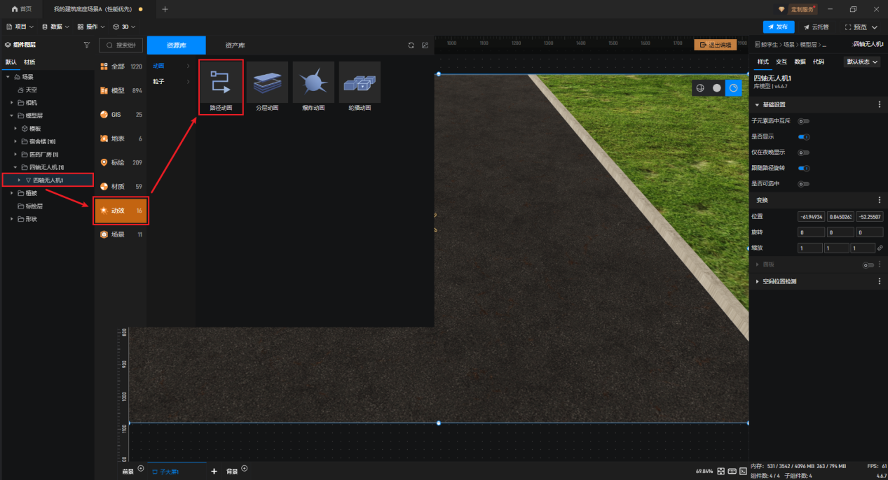 3. 添加后,选中无人机的模型图层,在“动效”中为其添加“路径动画”。