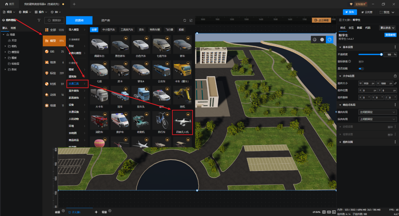 2. 接着,在“模型-交通工具”中选择“四轴无人机”。