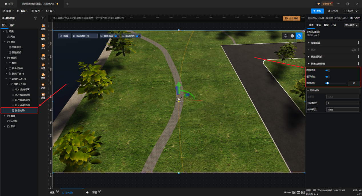 8. 选中“路径动画”图层,然后开启“播放动画”和“循环播放”,并根据需要调整无人机移动速度。