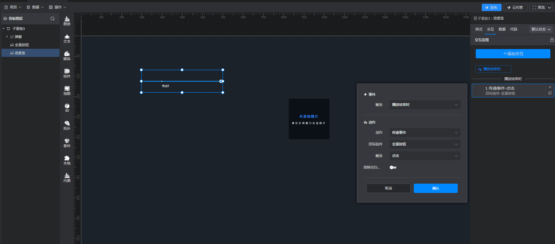 1、可以先给图片开启选中,然后图片上的打开弹窗交互也改用“选中”事件2、然后进度条上的交互改成播放结束时触发图片组件的选中事件,这样就可以了