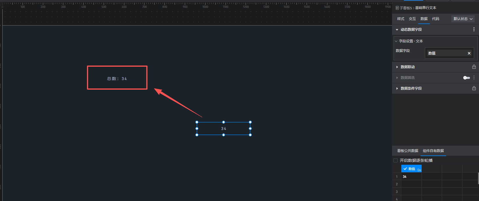可以用数据微处理,参考示例写输入公式即可,"{:data}"是固定写法,内容的其他部分可以手动输入,比如数据是“34”,最终需要展示的文本为“总数:34”,那么公式就写“总数:{:data}”
