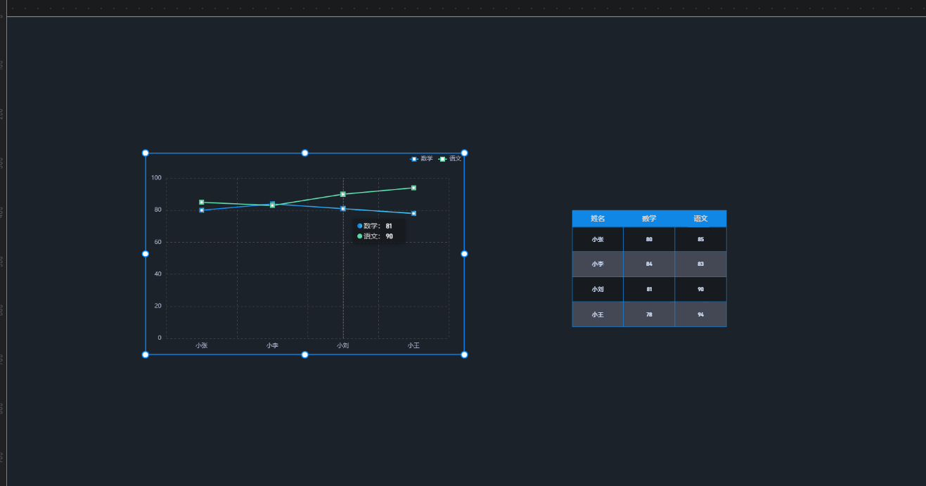 1、给折线图设置两个状态,分别是数学和语文,然后给两个状态的Y轴字段分别勾选语文和数学字段2、表格组件上添加逐项交互,点击语文列时切换折线图的状态为“语文”,点击数学列时切换“数学状态”