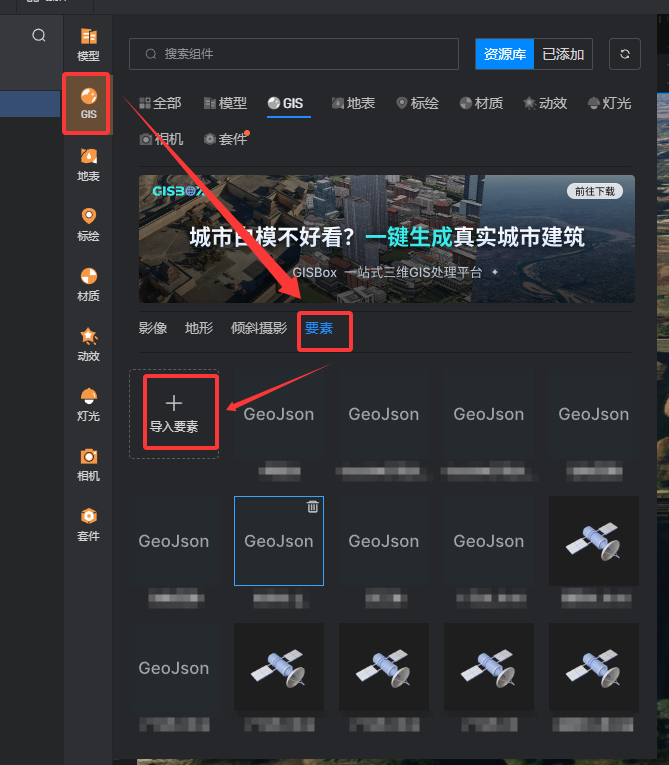 1. 您需要在山海鲸可视化软件中,鲸孪生的GIS的要素中导入geojson文件。