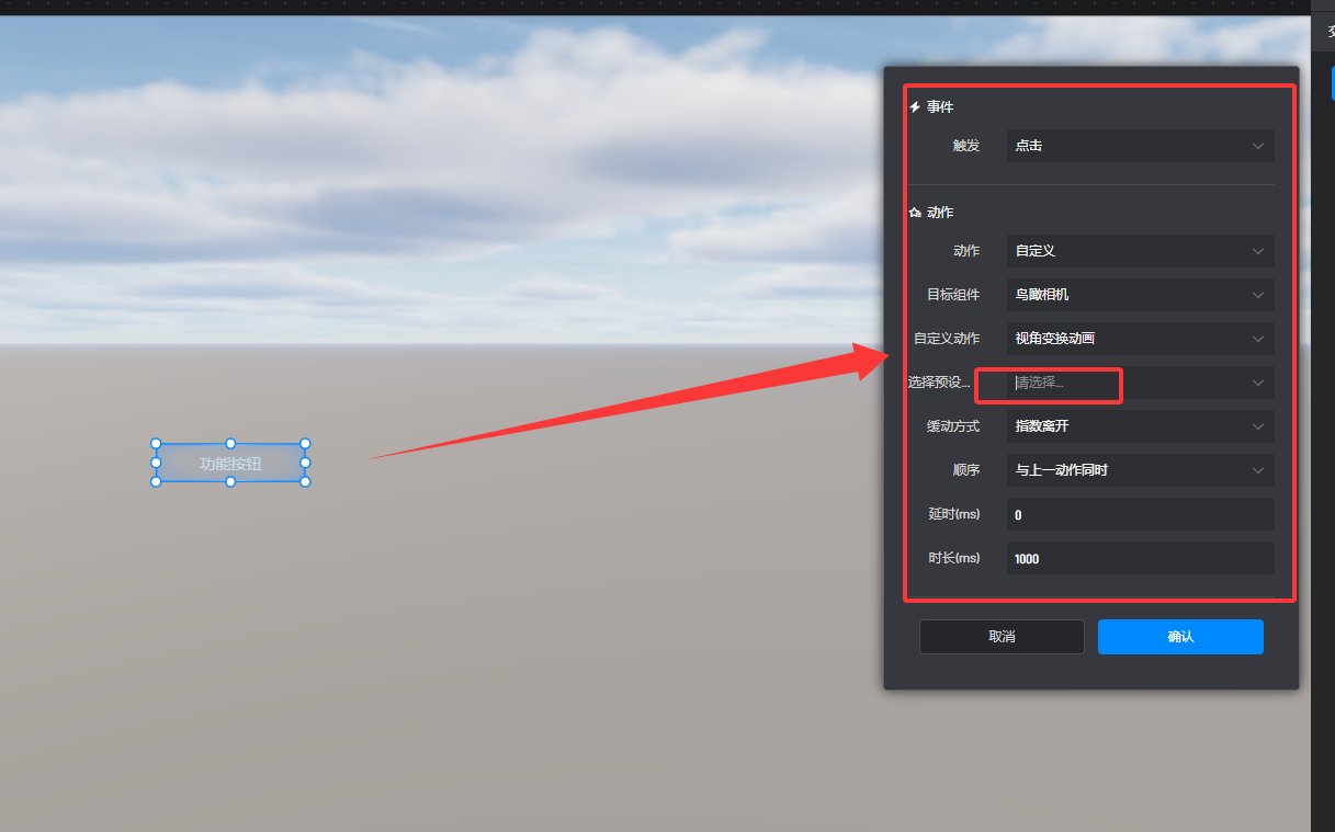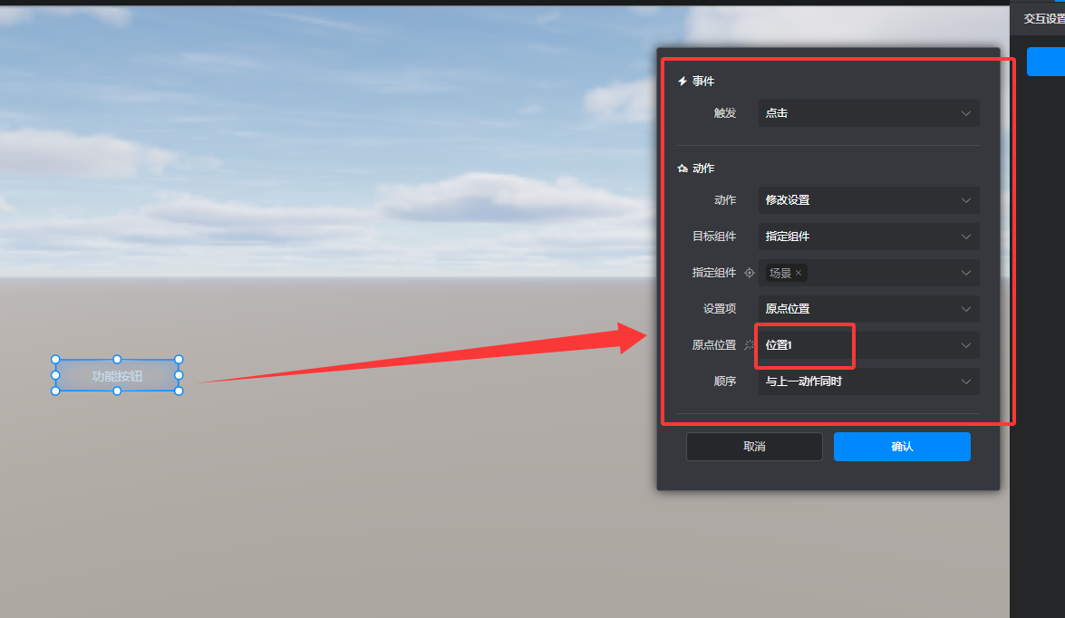 3、然后添加两个按钮(三维地图和GIS场景),给按钮添加交互控制模型的显示隐藏和视角的切换(还需要切换世界原点,不然会因为原点的不同导致视角不能正确切换)