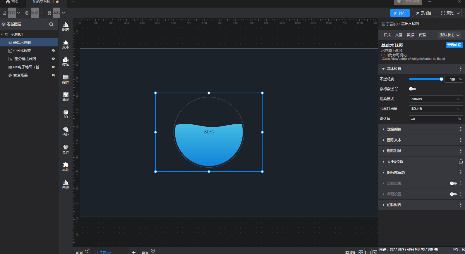 山海鲸可视化软件中水球图组件的水量多少是根据使用数据自动变化的,同时也支持直接手动调节,相关操作教程- 基础水球图 - 项目制作 - 山海鲸可视化