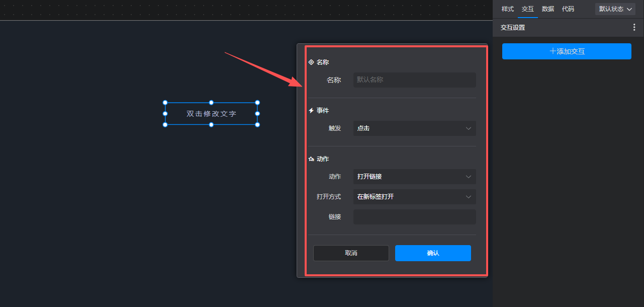 直接设置交互触发条件:选中需要添加超链接的组件,点击 “添加交互”,在 “事件” 中选择触发条件,