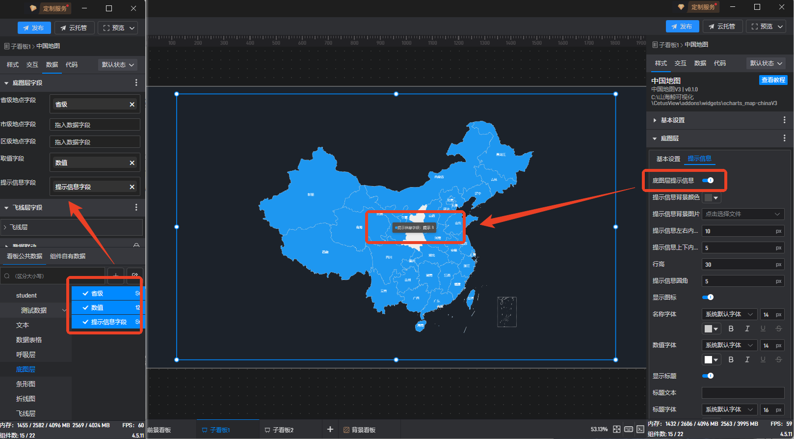 通过导入数据,在数据面板勾选对应的数据字段,并开启底图层提示信息,详细可参考-中国地图 - 项目制作 - 山海鲸可视化