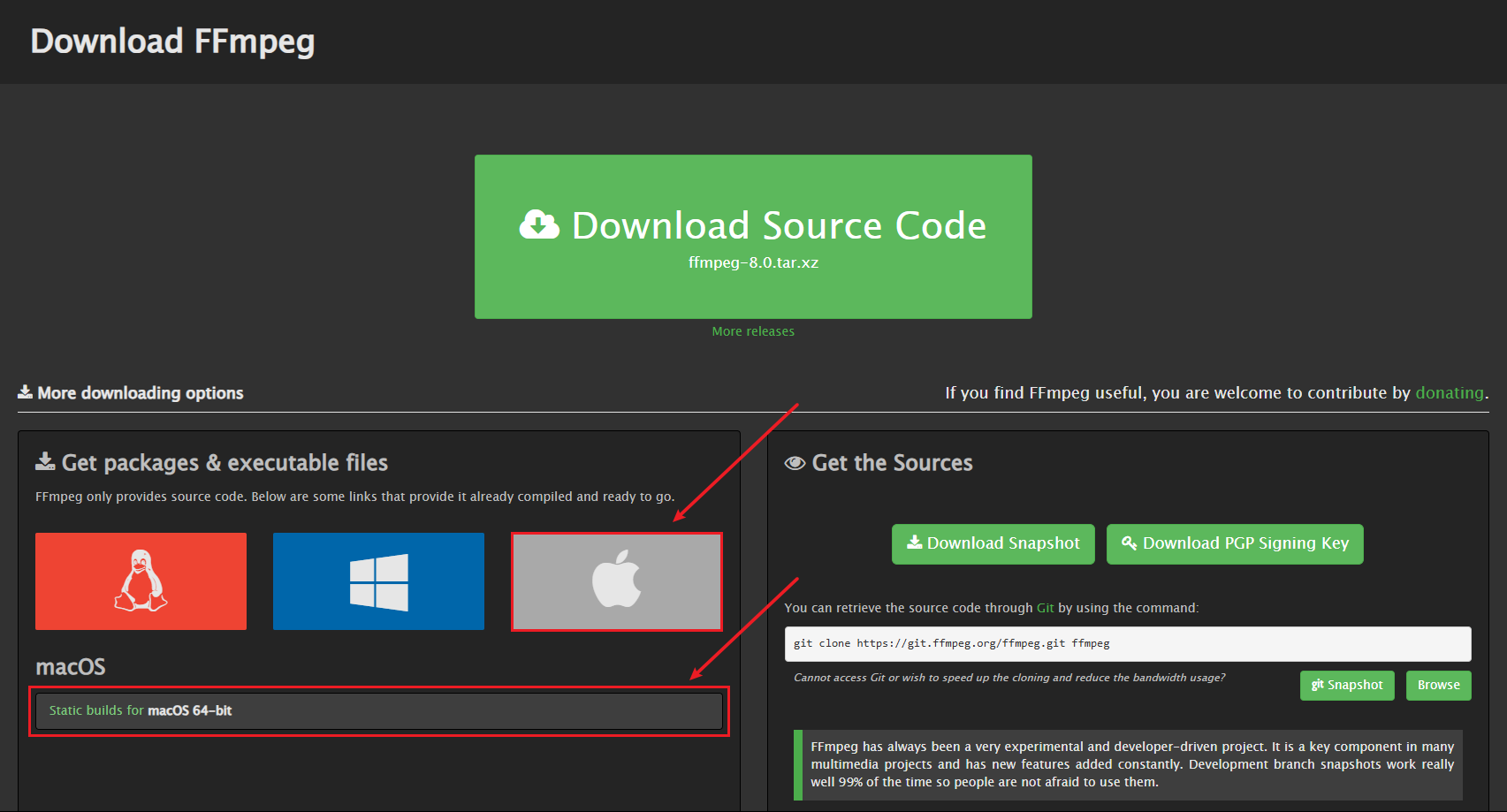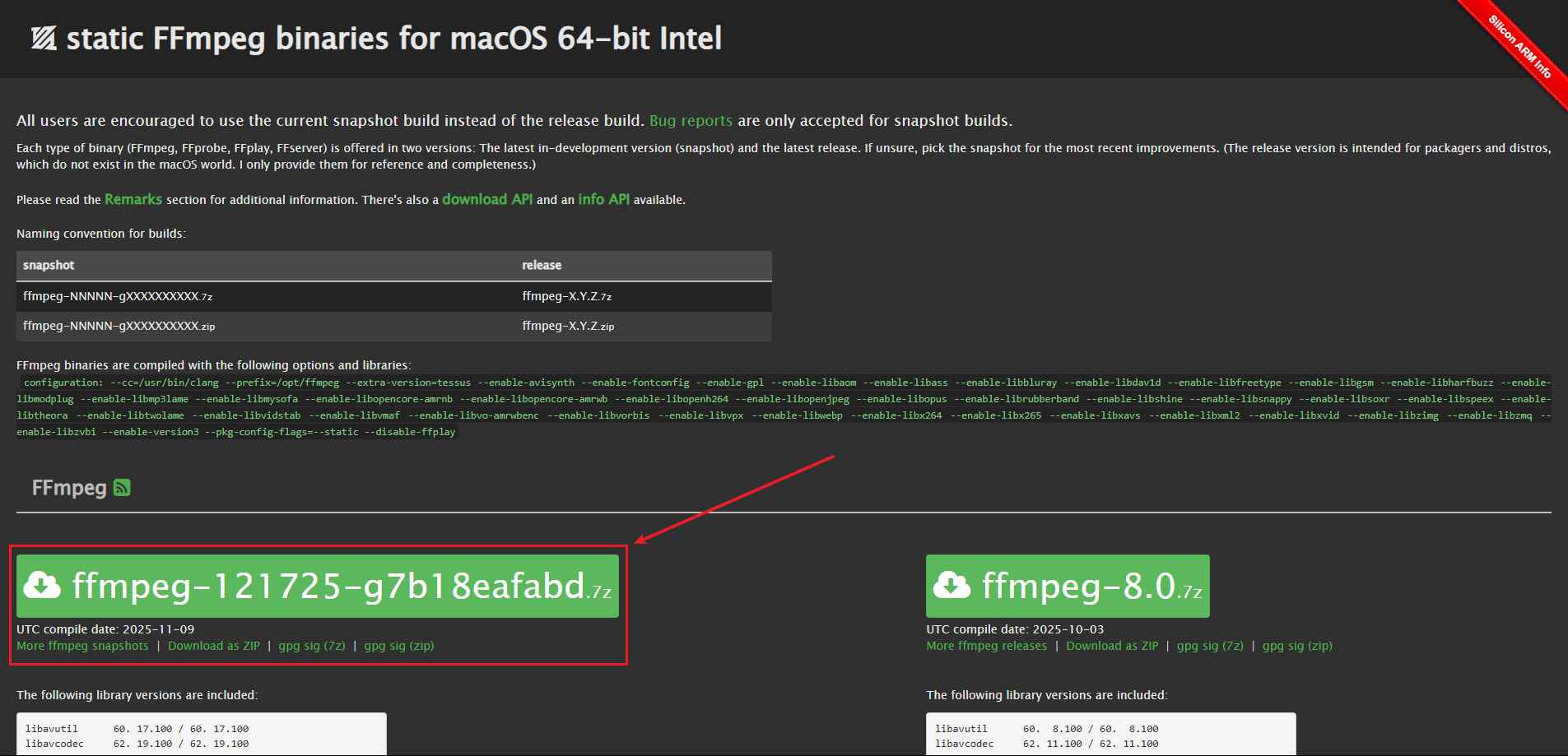 然后根据需要下载静态编译的 FFmpeg 二进制文件压缩包。
