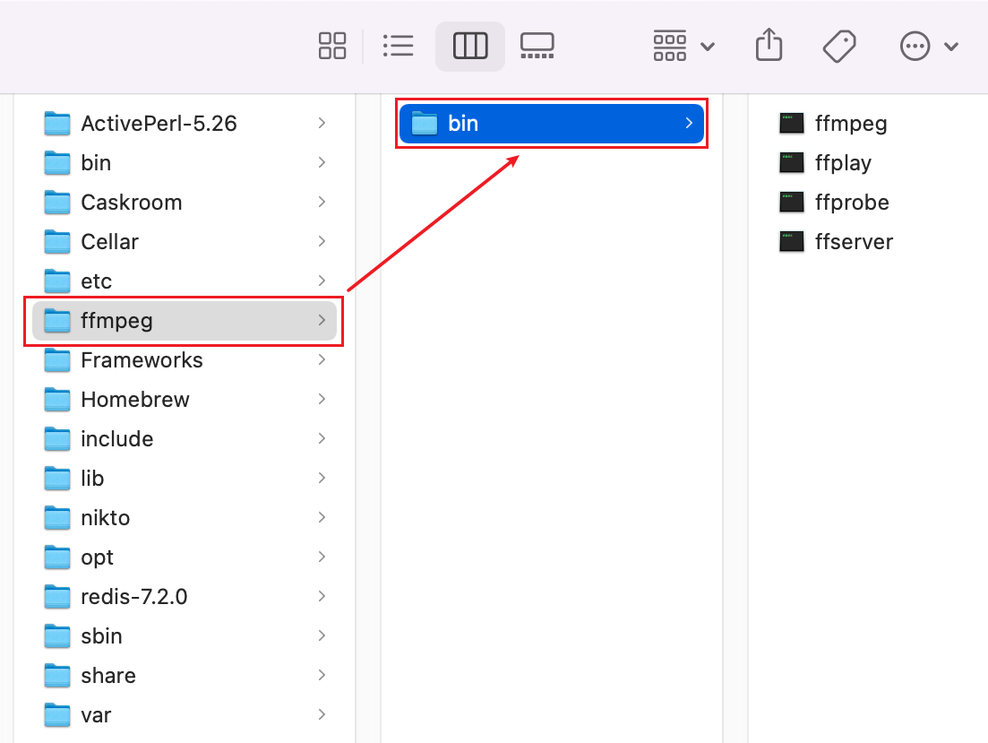 创建一个文件夹放置ffmpeg文件,例如:/usr/local/ffmpeg/bin,打开local目录后创建对应的ffmpeg和bin文件夹,解压ffmpeg压缩包后,放置对应静态编译文件。