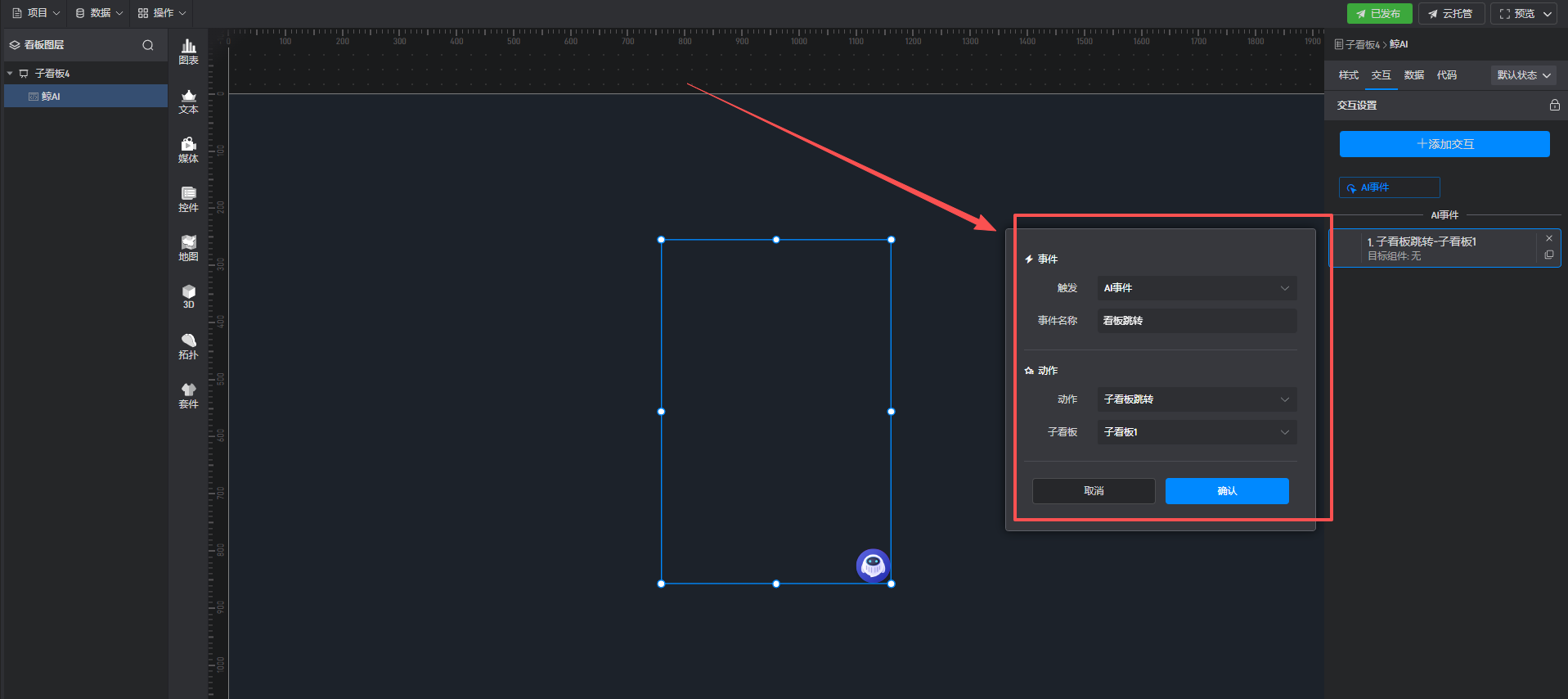 AI组件暂时还没有视频教程,有返回但交互没有成功触发可能是前置知识的提示语句的问题,比如需要触发一个事件名称为“看板跳转”的交互,前置知识可以写:“如果问到xxxx有关的,返回的name值为看板跳转”,建议检查一下