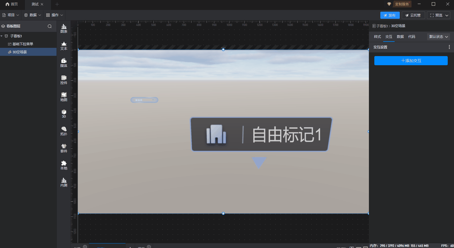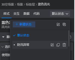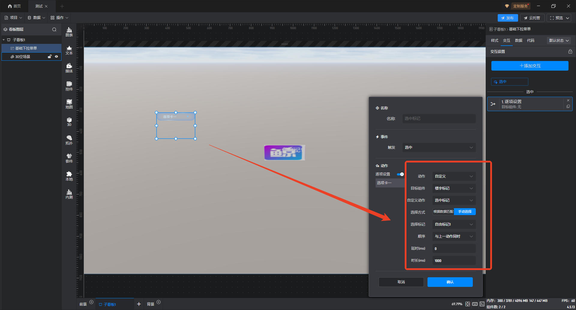 我在项目的空地图里设置了标绘点位,并给点位设置了两个状态(默认和异常),现在我想在子看板里设置一个下拉菜单,我该怎么设置交互去实现我选中某个菜单子选项后使我想要的那个标绘点状态从默认转为异常状态