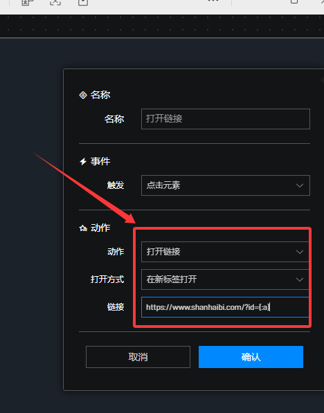 2、将项目参数给拼到要跳转的链接的后面,然后用交互去实现网页的跳转,链接参考格式:http/https://xxxxxx/?xxx={:项目参数}