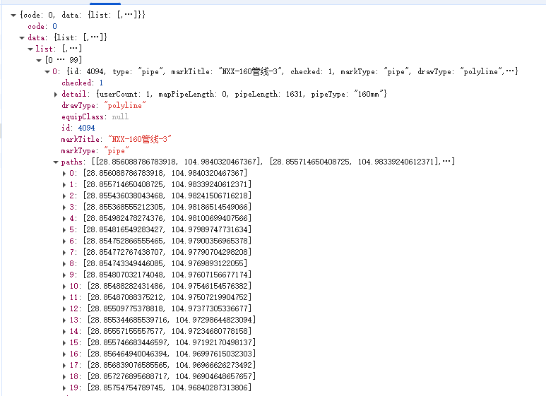 1.地图上管线的是通过经纬度生成的,例如[[28.856088786783918, 104.9840320467367], [28.855714650408725, 104.98339240612371]] 一个二维数组,一维是经纬度;
