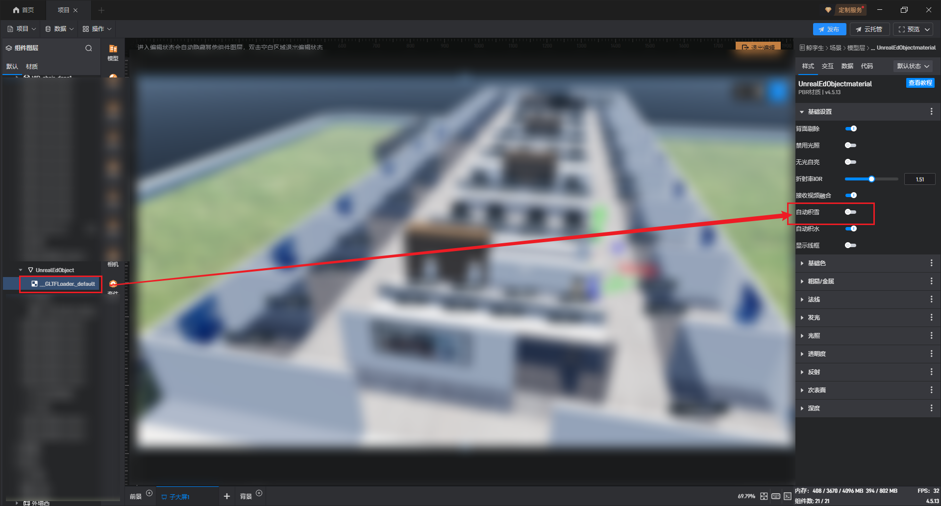 根据项目看,相同的模型有重叠,需要在建模软件中将多余的模型去除,然后选中模型的材质,将自动积雪设置项关闭