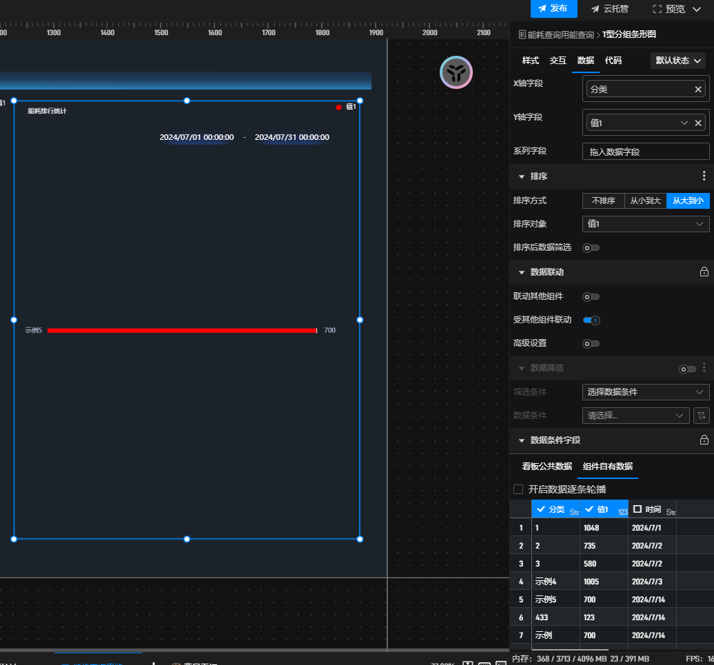 用时间范围选择器联动条形图,时间范围选择器需要勾选数据,并且需要和条形图的数据满足数据联动的效果,参考教程:【功能演示】时间选择器组件联动数据表格组件-数字孪生可视化产品交流社区。