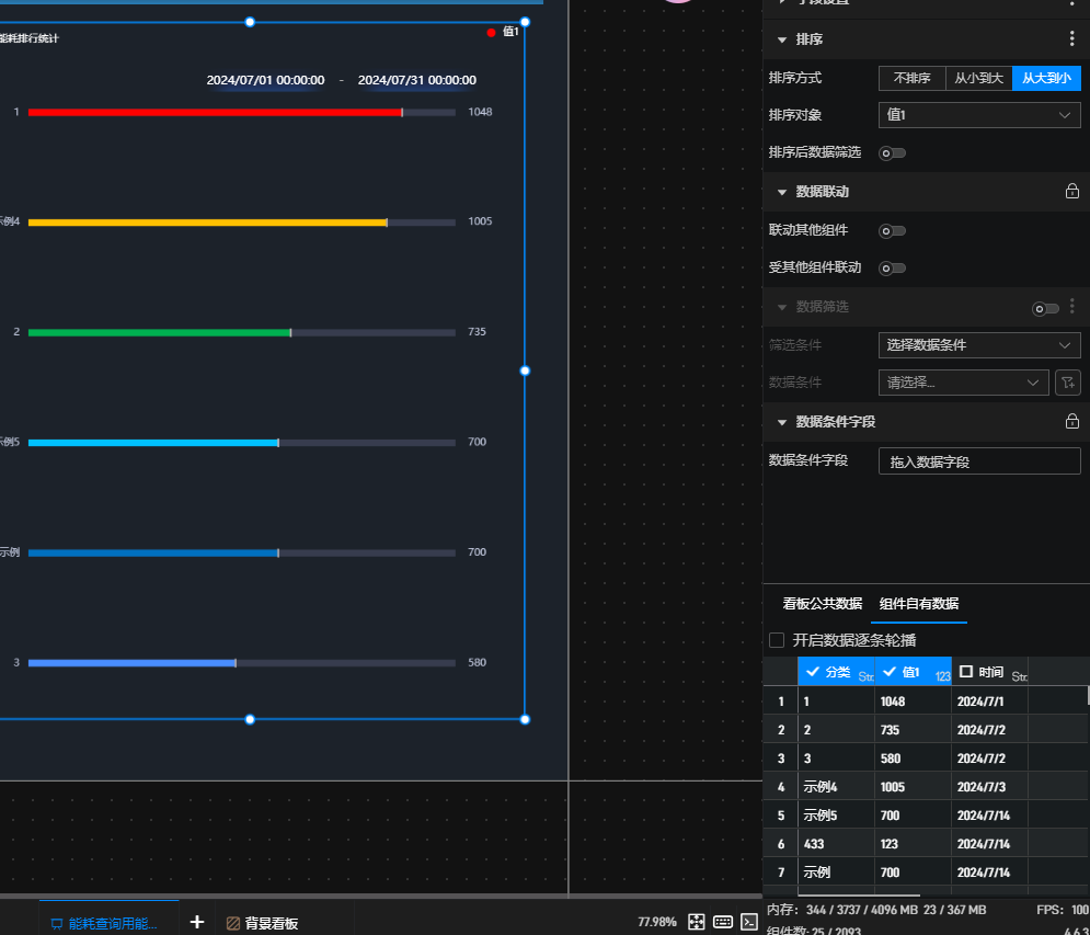 我这里图表组件开启后获得数据不太对,我想通过时间联动条形图条形图,x轴名字, y轴值,可以通过时间进行筛选;我启动了时间筛器选联动其他组建条形图联动其他组建,建立并使用时间字段(string),但是不行