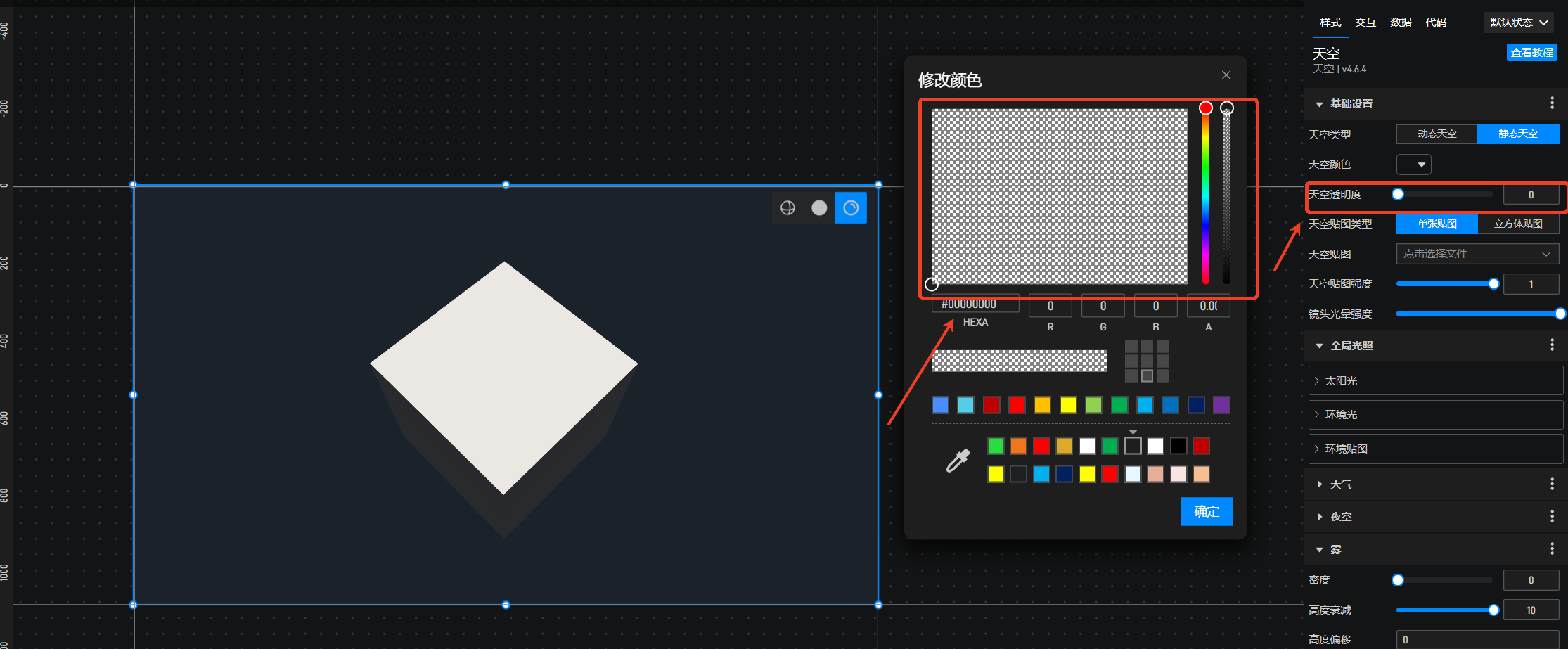 双击进入编辑模式,将天空透明度降低为0,天空颜色为透明。