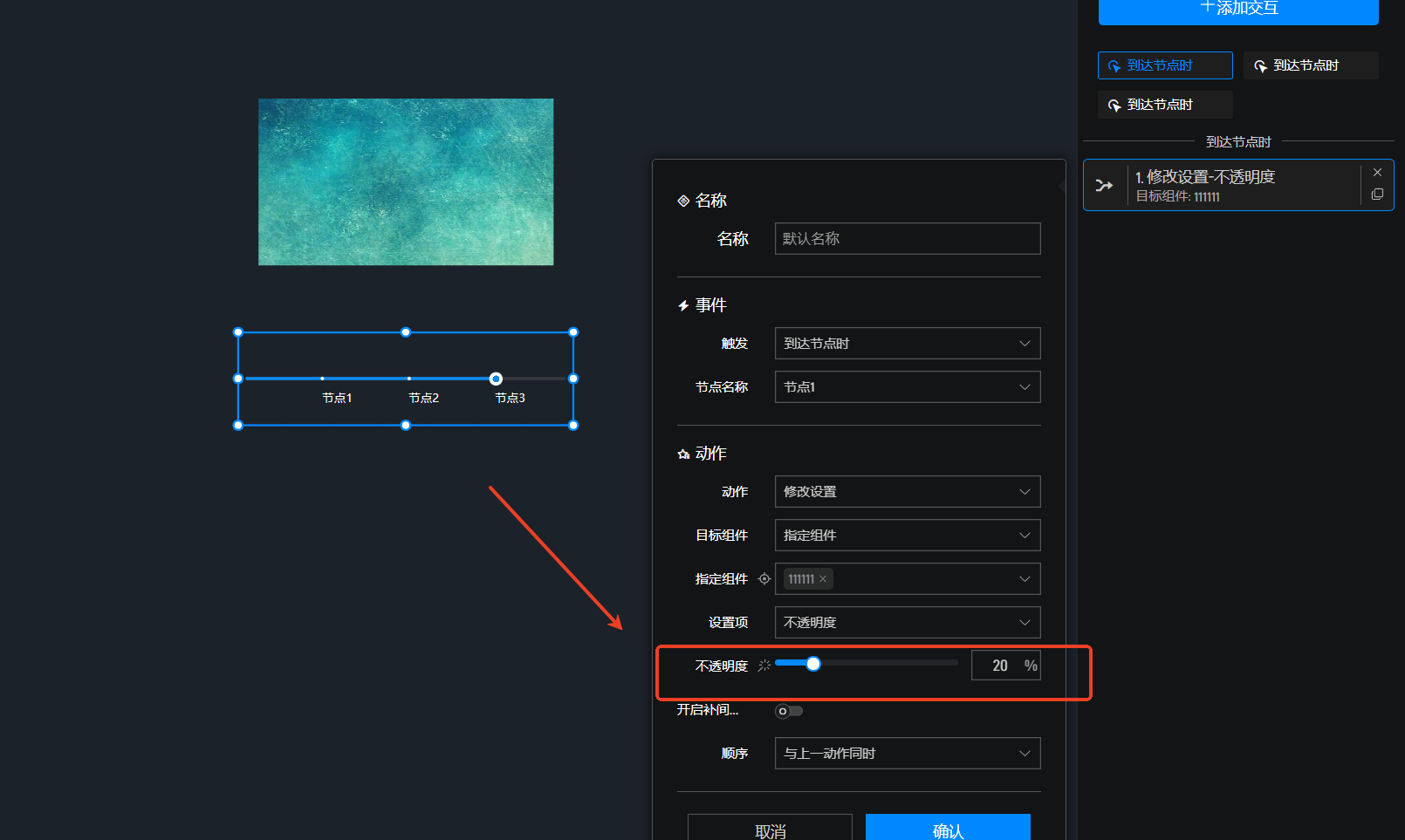 2.想要用进度条来控制图片的显隐,选中进度条,添加交互分别设置各个节点的不透明度即可。