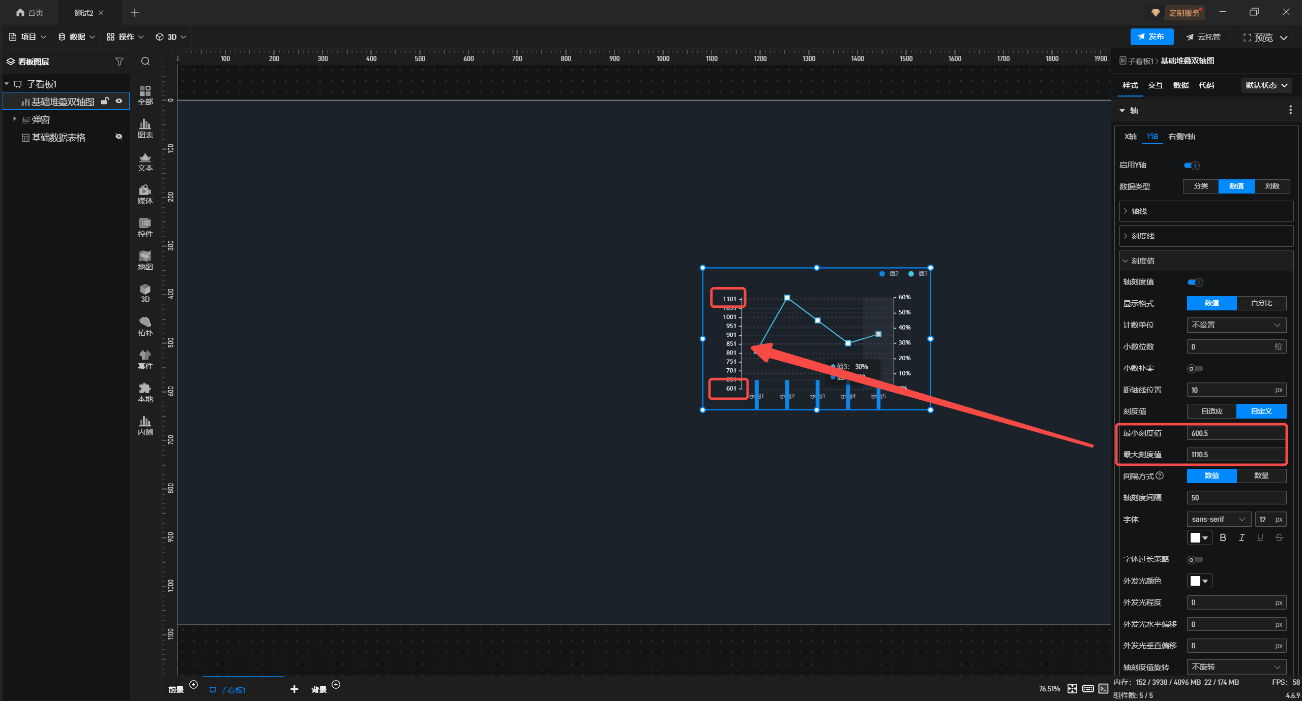如图,设置右侧Y轴时,最小刻度值不能为小数,Y轴可以设置为小数,导致在设计百分比目标线时刻度值无法对齐。