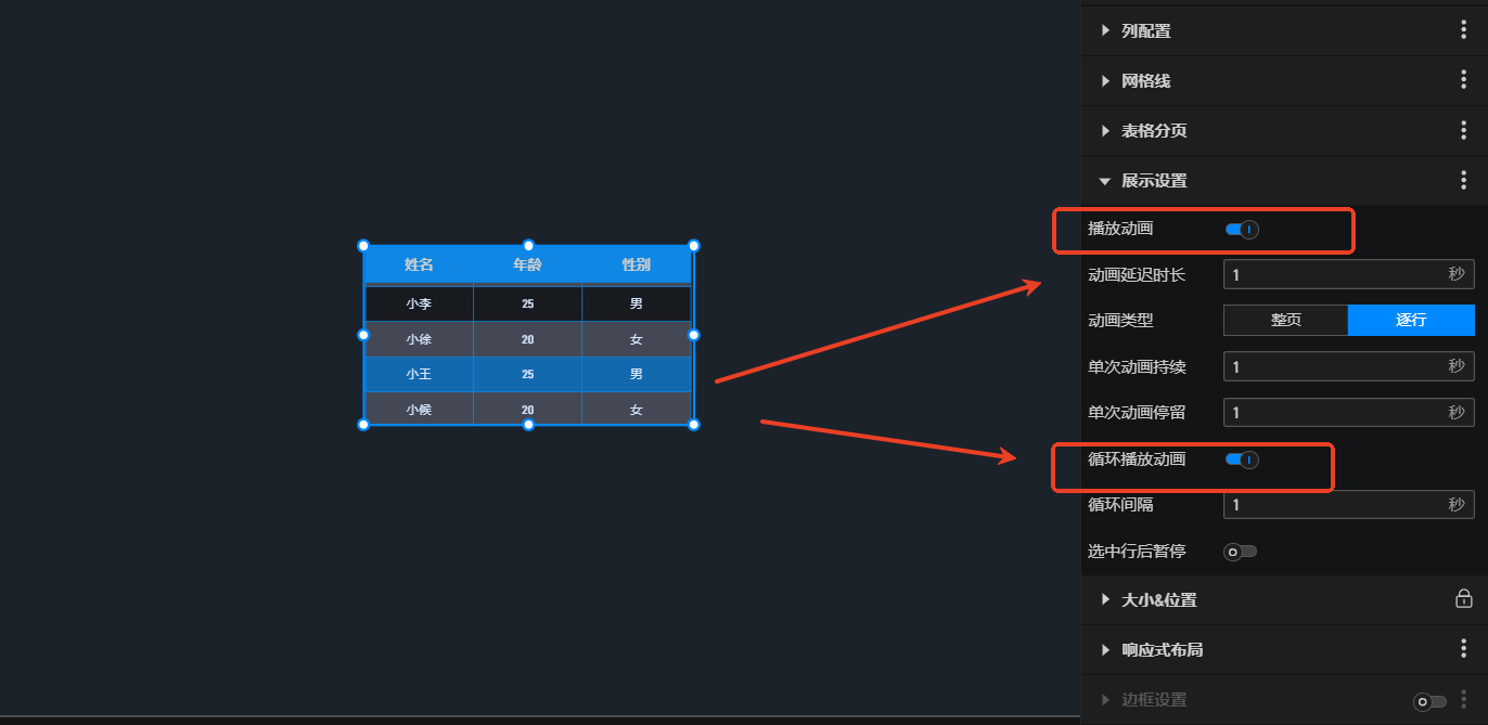 表格连接数据,然后在右侧样式面板中设置一下表格展示设置的动画循环播放。
