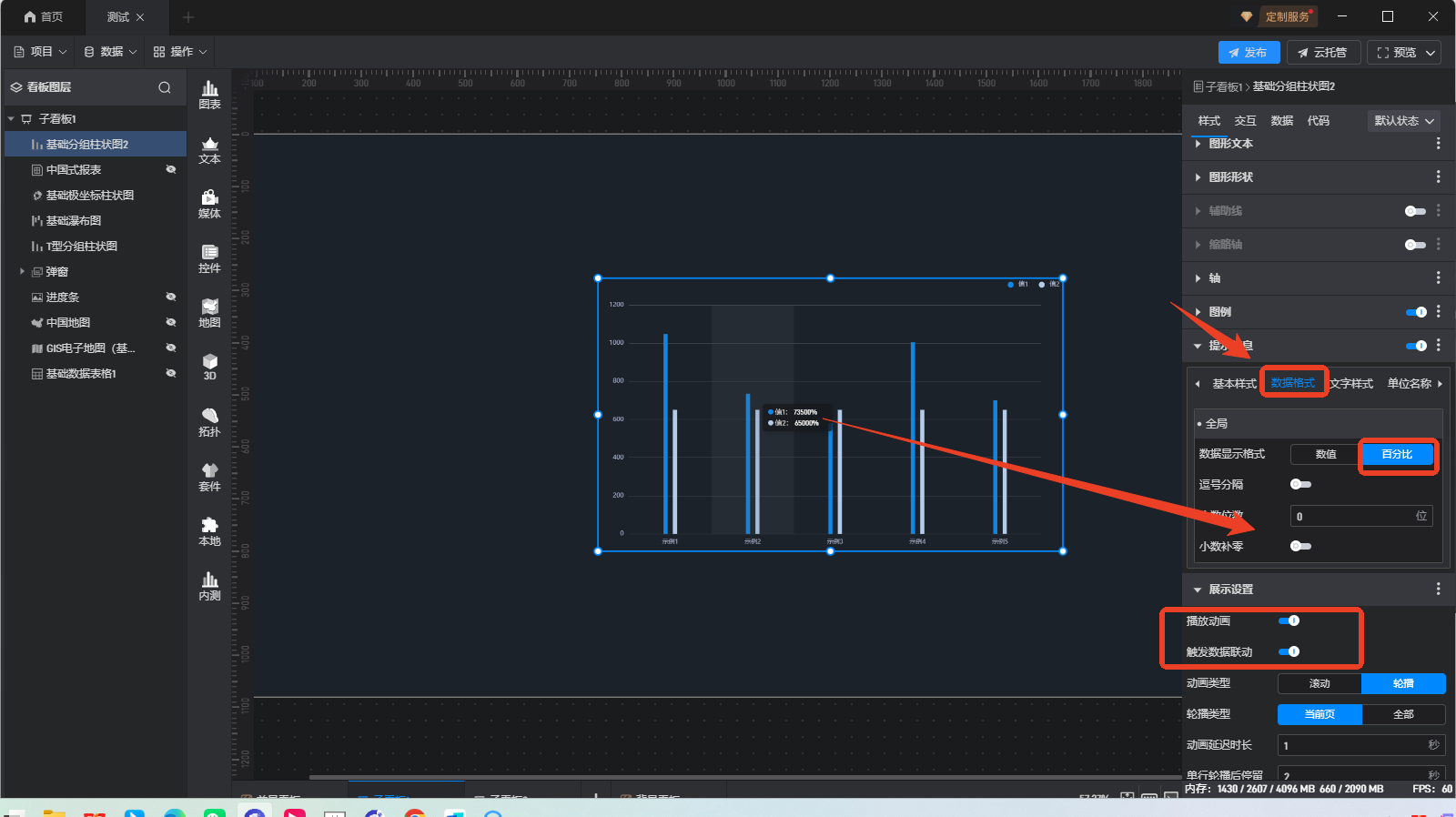 在“样式”下打开“展示动画”,选择“数据格式”,在“全局--数据显示格式”中改为“百分比”即可。
