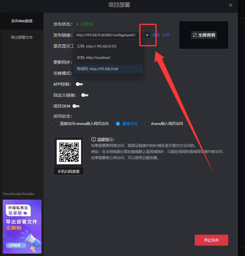 2、想要发布的链接能被公网访问,需要发布的设备能被外网访问,比如将山海鲸安装在能被外网访问的公网服务器上,然后在发布页面将链接改为公网链接