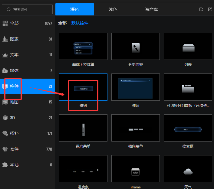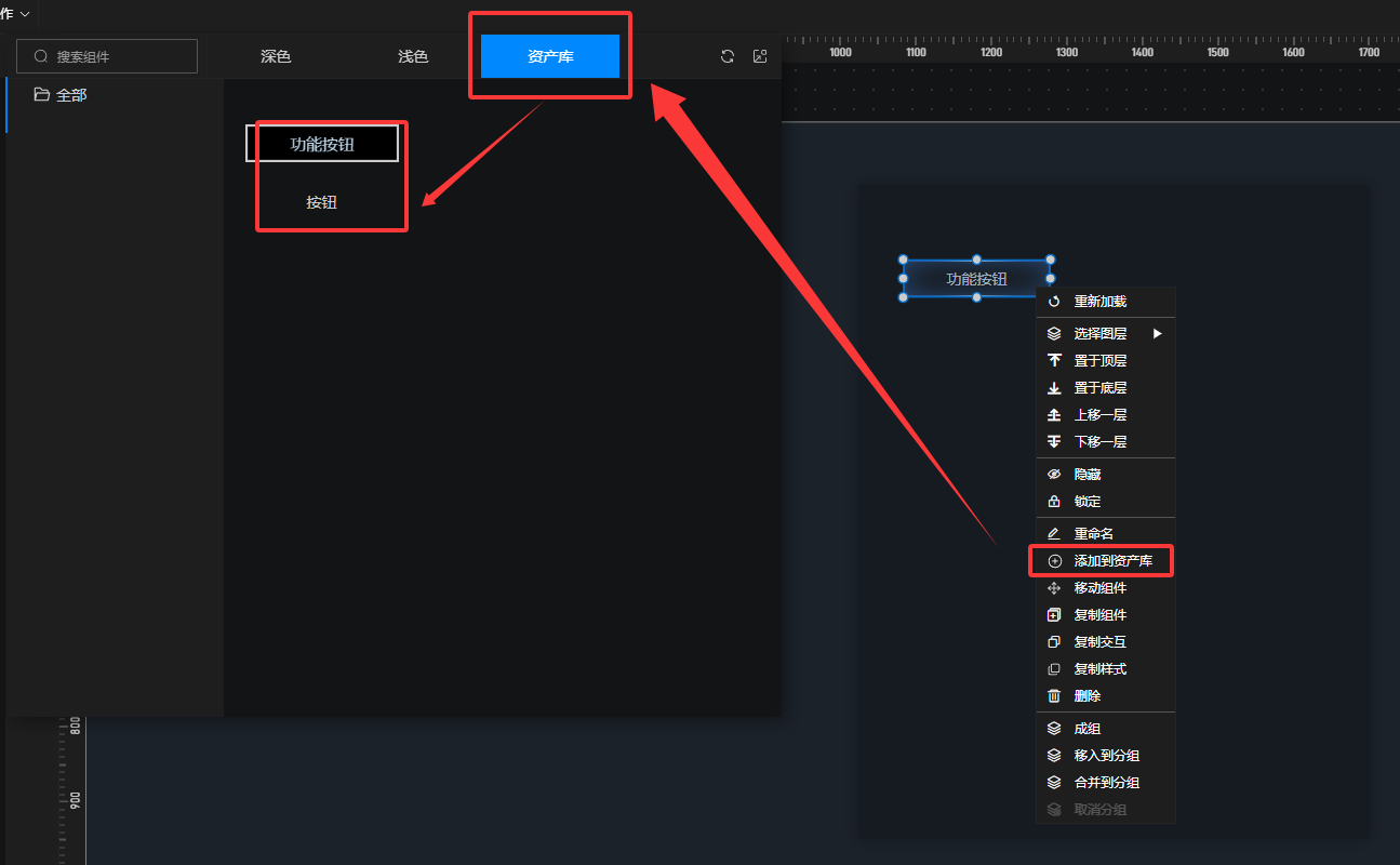 2、在4.6.0及以上版本,新增了资产库功能,可以将设置好样式的按钮组件右键放在资产库中,后续在其他组件中可以添加使用
