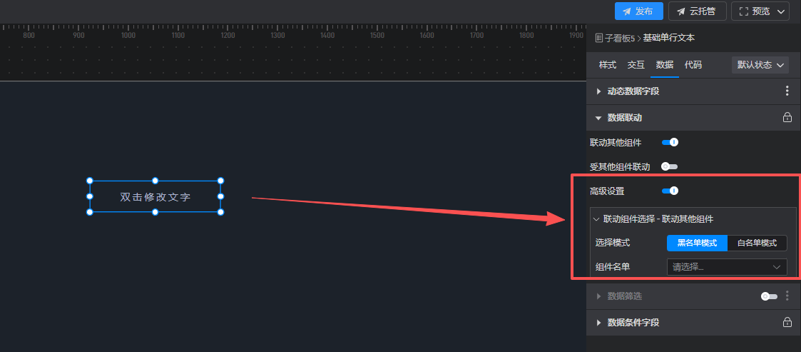 可以使用数据联动高级功能来限制一下组件联动范围,黑名单模式就是将组件黑名单中的组件排除在数据联动组件之外,白名单模式,就是只联动组件白名单中的组件;