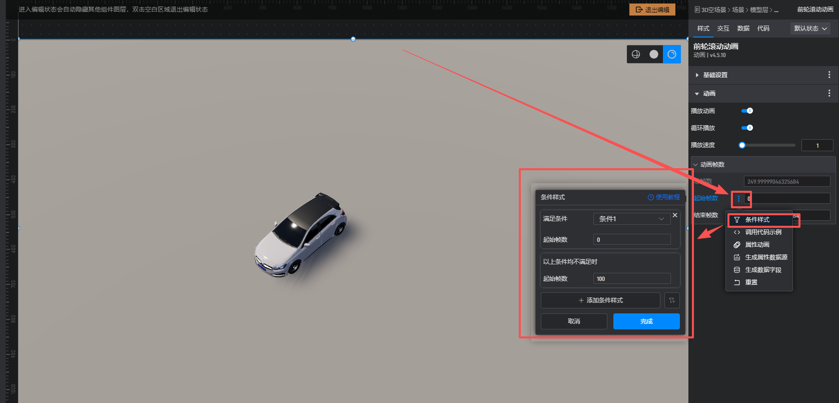 可以在模型动画的起始帧数和结束帧数设置上分别使用条件样式,需要用到数据条件,点此参考数据条件使用教程: