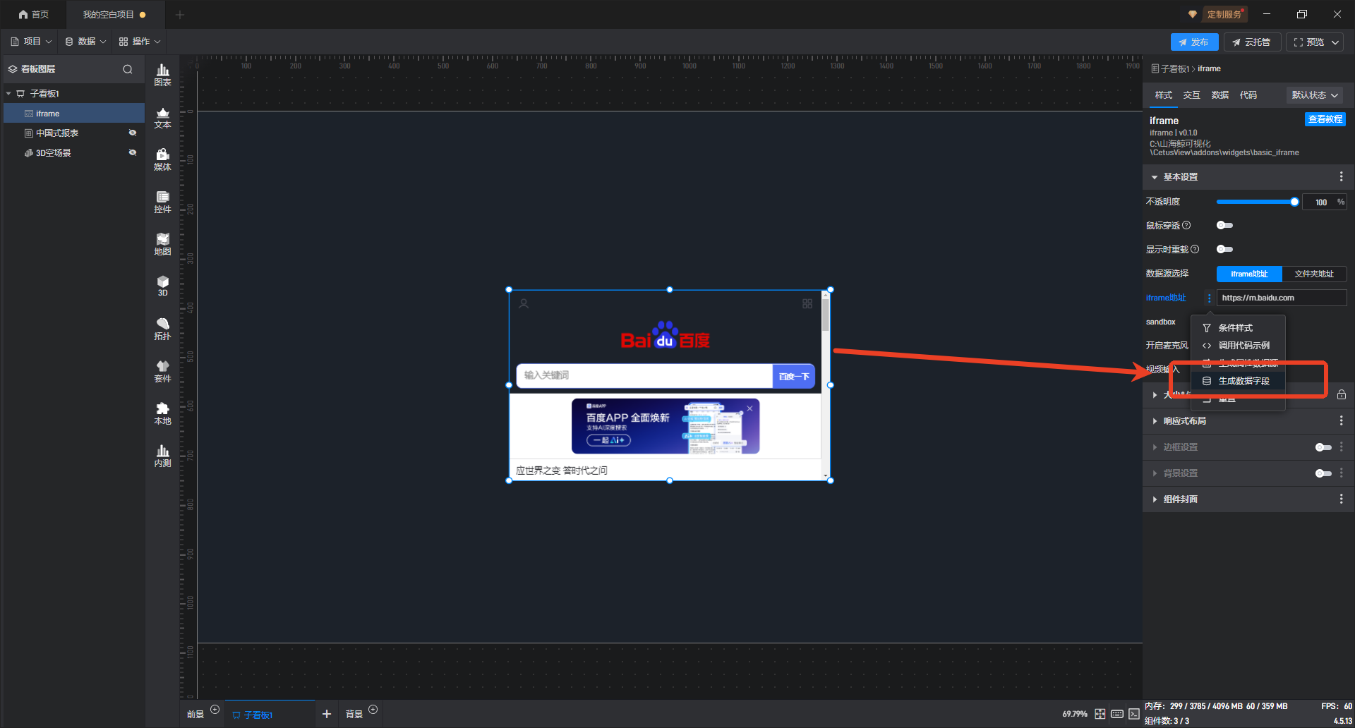 可以将iframe组件生成数据字段,勾选字段,然后勾选相应的字段