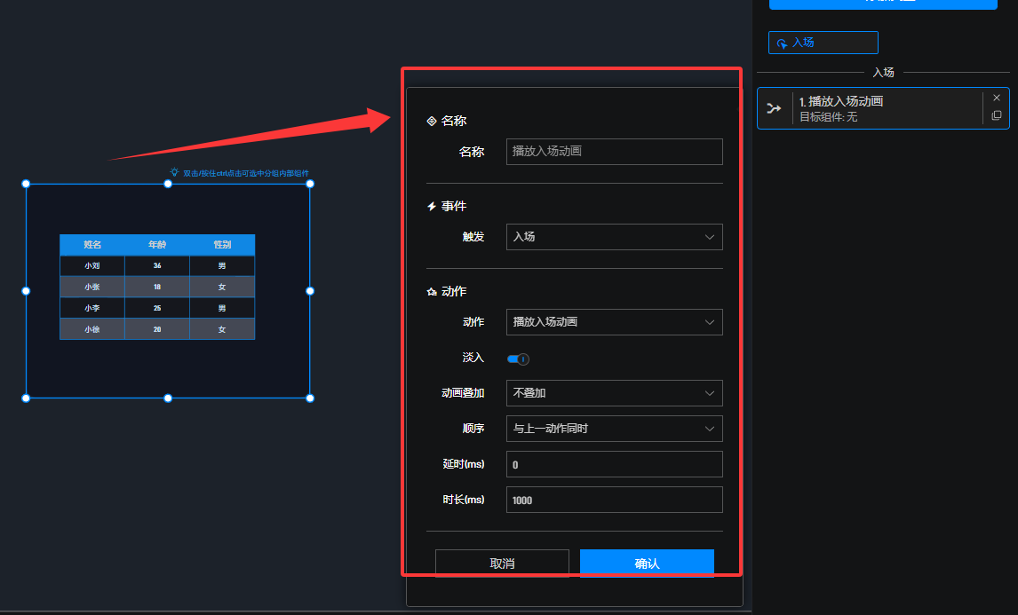 在分组面板的两个状态中添加入场/离场时触发播放入场/离场动画的交互,通过该交互去实现补间动画的效果。因为通过切换状态去控制组件的显示隐藏的时候,会有组件隐藏和显示的过程,就会触发对应的入场/离场动画。