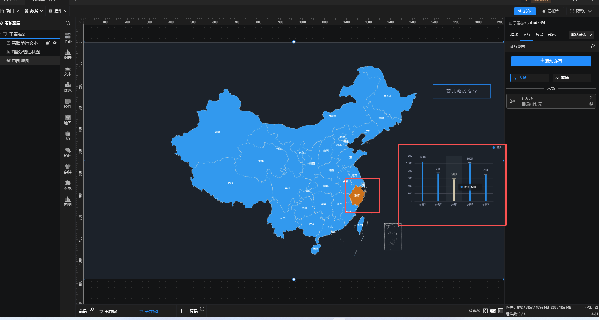 点击地图区域,右侧数据看板展示该区域的相关数据