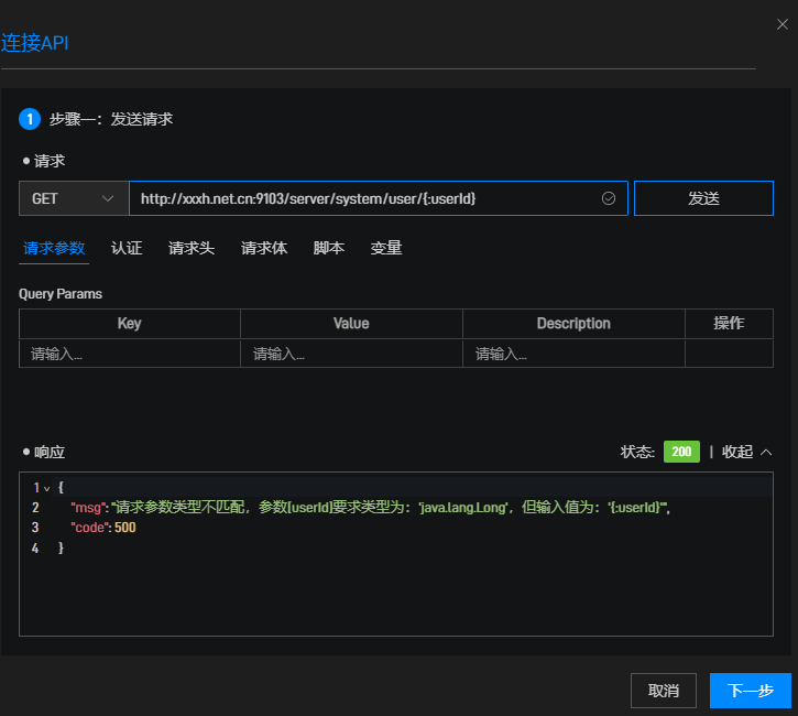 我有一个获取用户详情的接口:http://localhost/server/system/user/15,其中15是动态参数。现在假设我要从项目参数userId里获取该参数,我写成http://localhost/server/system/user/{:userId},发现不可行,我该如何实现连接获取用户详情的接口