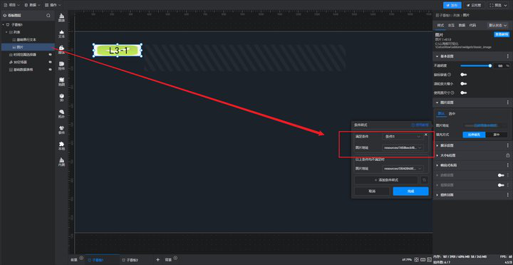 使用列表组件,在组件中添加图片和文本组件,列表和文本都要勾选数据,创建数据条件,图片地址采用条件样式即可。