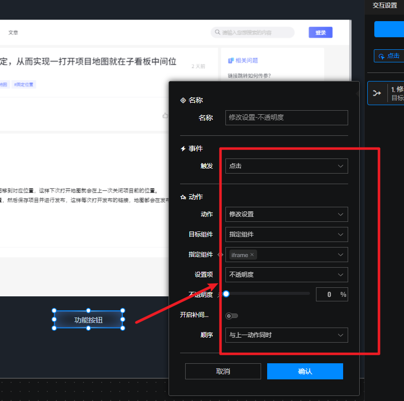 1、通过点击其他组件去隐藏iframe,比如按钮,给按钮添加交互去降低iframe的不透明度。