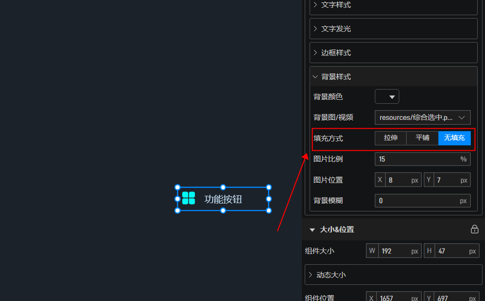 选中按钮组件,在样式中设置背景样式,将填充模式改为无填充,设置符号的比例以及位置即可。